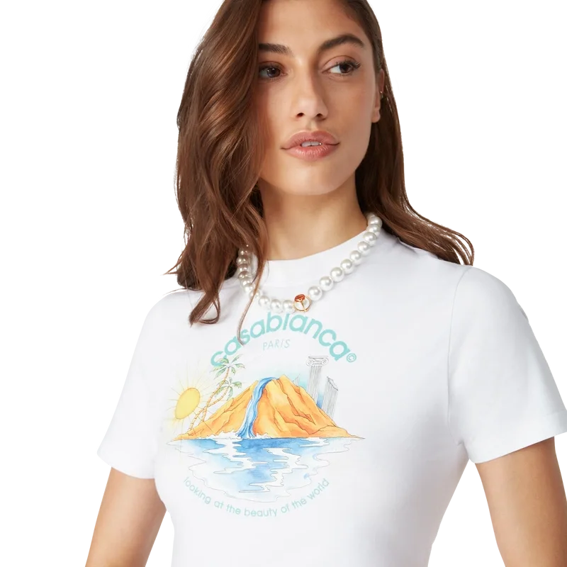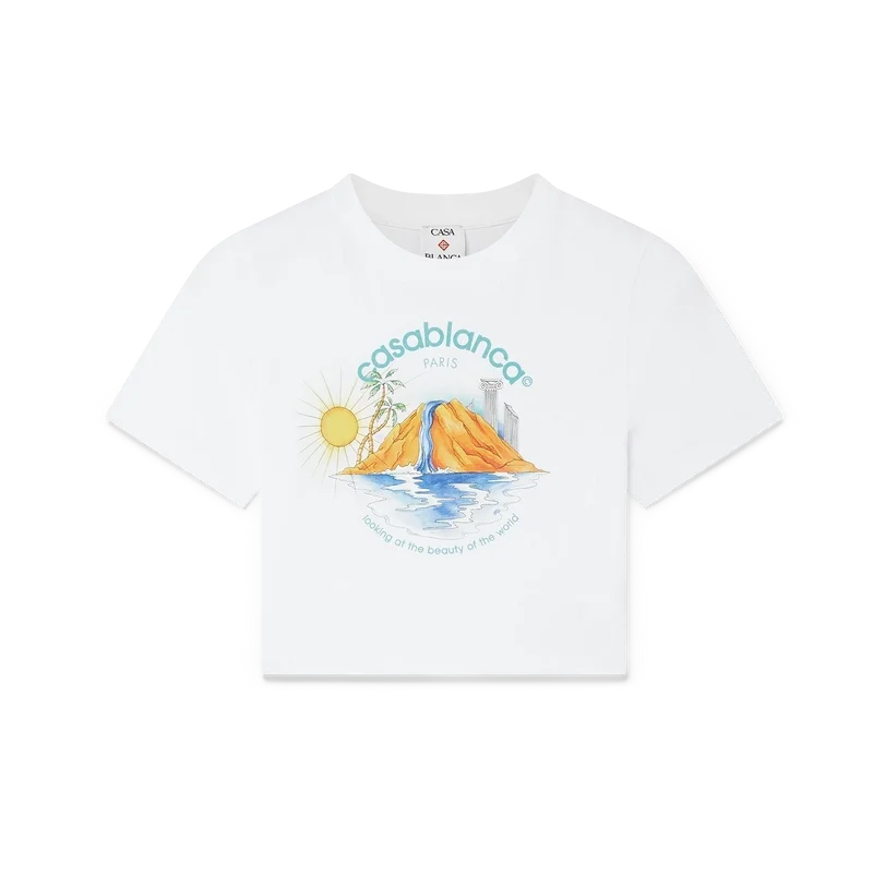 Het Oasis Cropped T-shirt is een bedrukt ontwerp met korte mouwen, gemaakt van biologisch katoen, met het seizoensgebonden artwork van het huis met ontwerpelementen uit de natuur, architectuur en tennis. Afgewerkt met een klassieke ronde hals. Ontworpen om boven de navel te vallen.