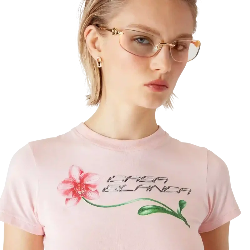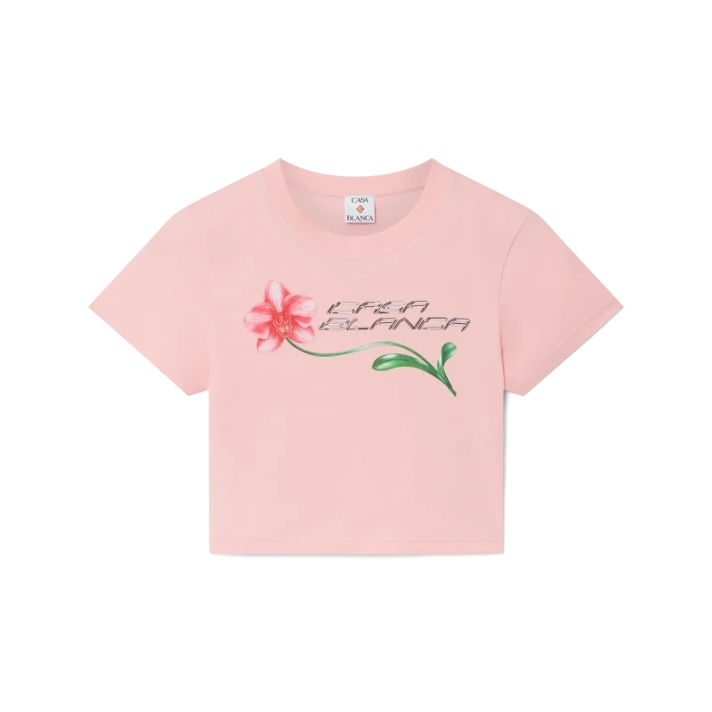 Het Orchid Logo Cropped Baby T-shirt is een verfijnd T-shirt met korte mouwen en een getailleerd silhouet, voorzien van het kenmerkende Orchid-logo van het huis in combinatie met het Casablanca-logo. Het ontwerp wordt afgerond met een cropped zoom voor een nonchalante, moderne afwerking.