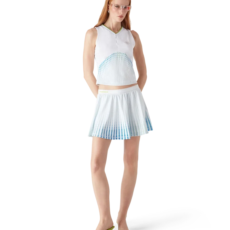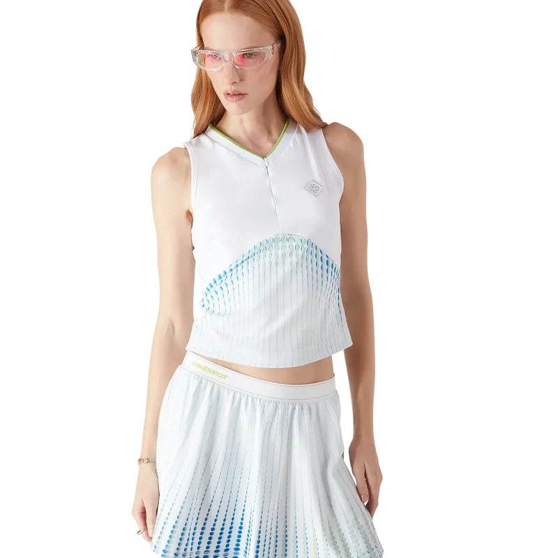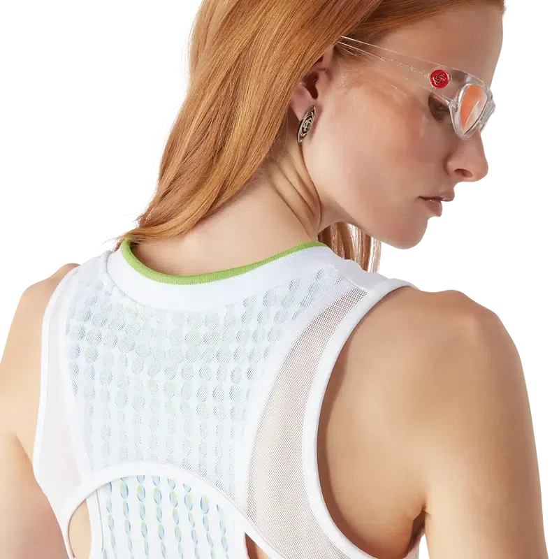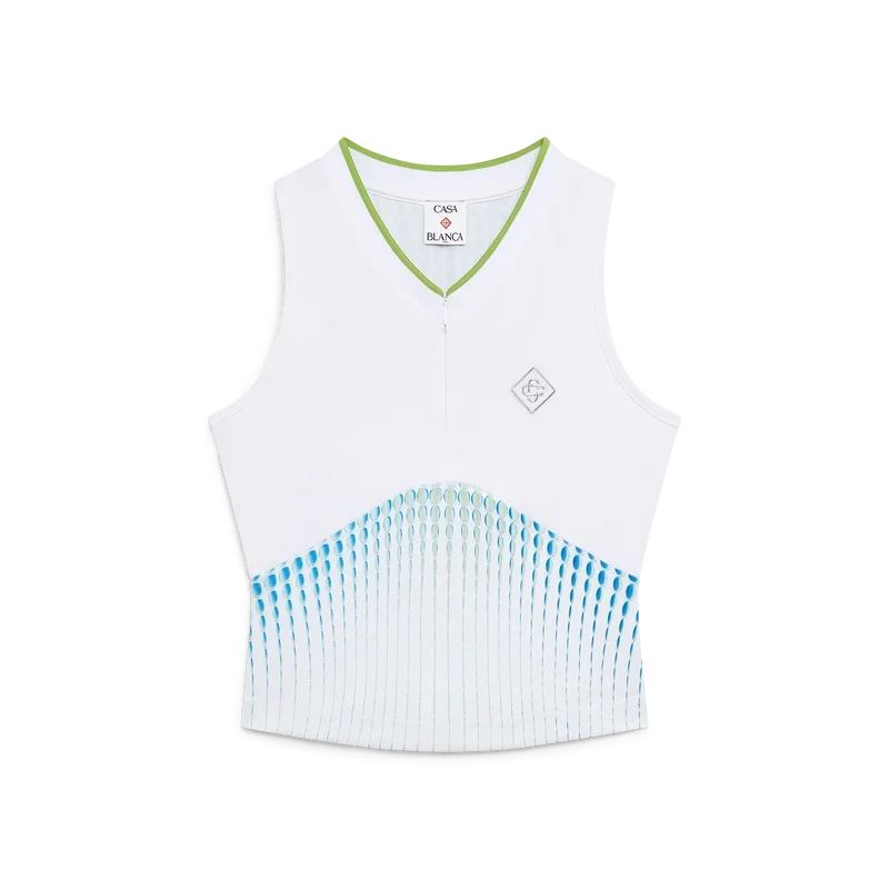 De Tennis Racer Top met jacquardprint is een mouwloos ontwerp met het zilveren diamantlogo van het huis. Afgewerkt met een contrasterende ondiepe V-hals, een ritssluiting, een bedrukt bovenstuk en een slank silhouet.