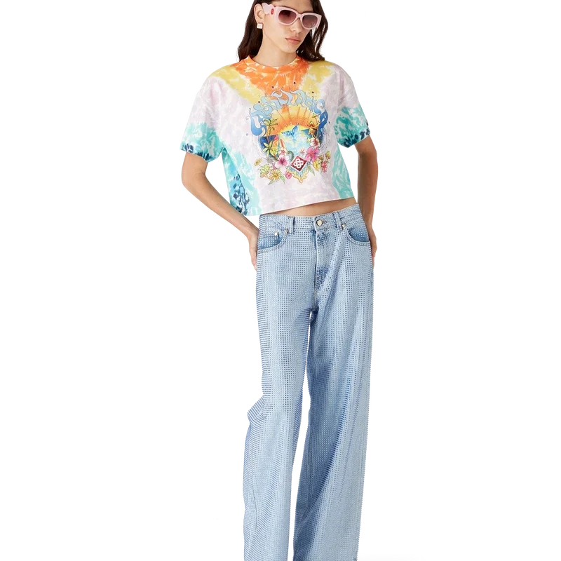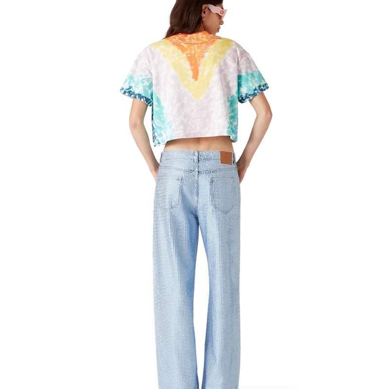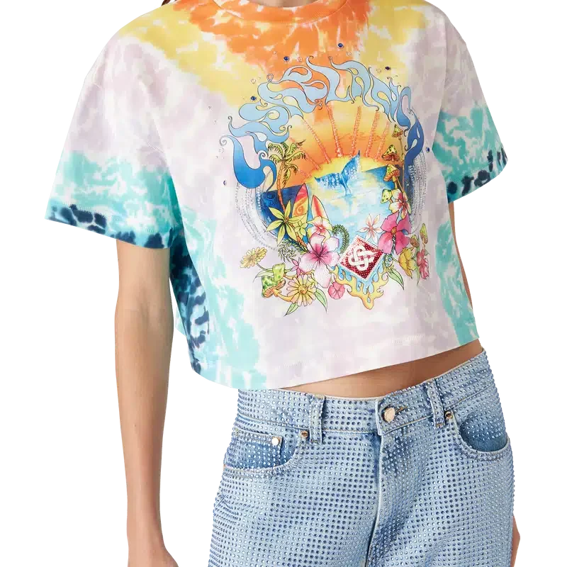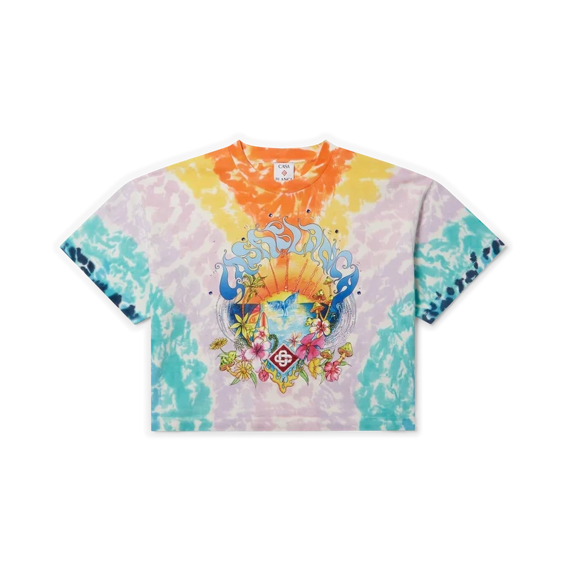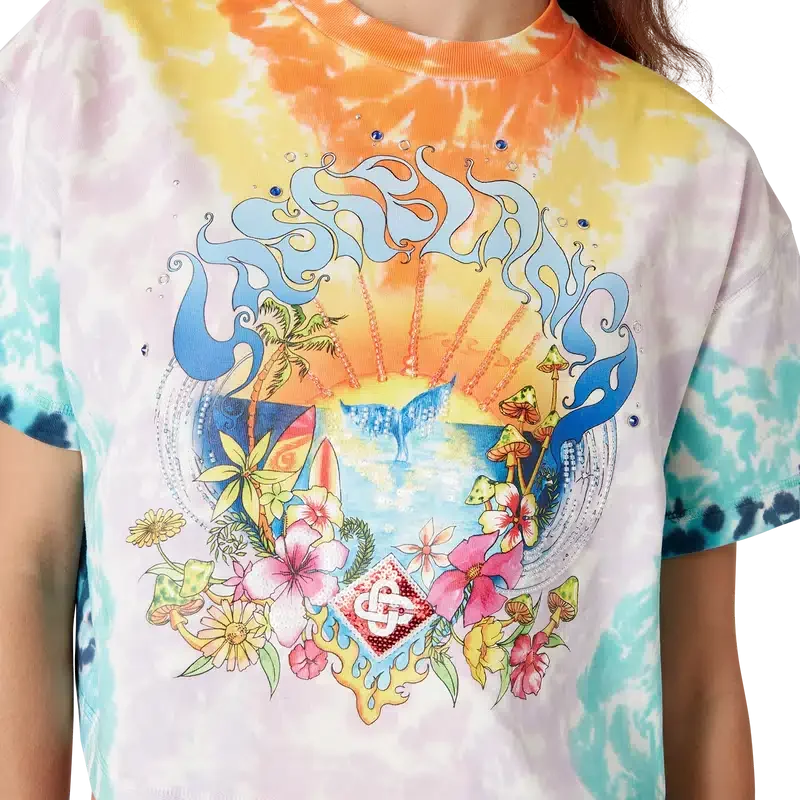 Het Surf Trip Tie Dye T-shirt is een bedrukt ontwerp met korte mouwen, gemaakt van biologisch katoen. Het is voorzien van seizoensgebonden kunstwerk geïnspireerd op de vintage surfcultuur van Malibu, met typografie uit die tijd op een tie-dye achtergrond die verwijst naar de hippiecultuur. Afgewerkt met een klassieke geribde ronde hals. Ontworpen om boven de navel te vallen.