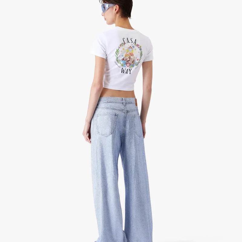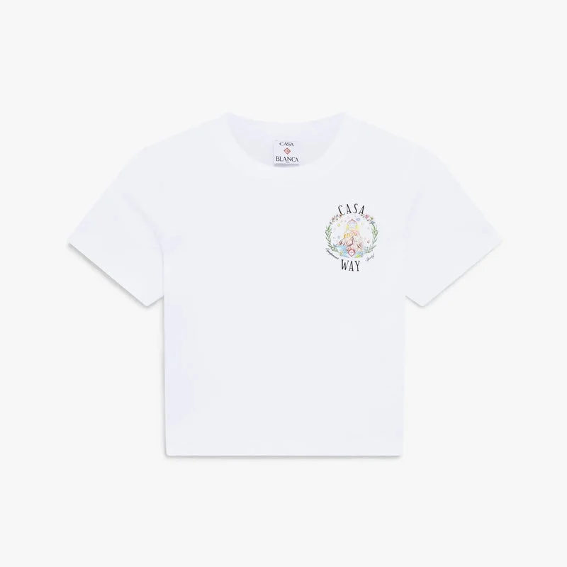 Het witte Casa Way-T-shirt met korte mouwen voor baby’s heeft een cropped model en is voorzien van de Casa Way-illustratie van dit seizoen, die de utopische visie op Ibiza weergeeft als bestemming voor een bijna religieuze ontdekkingsreis door het gevarieerde muzikale landschap. Afgewerkt met een klassieke ronde hals en een slank silhouet.