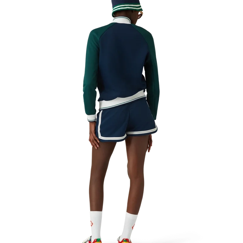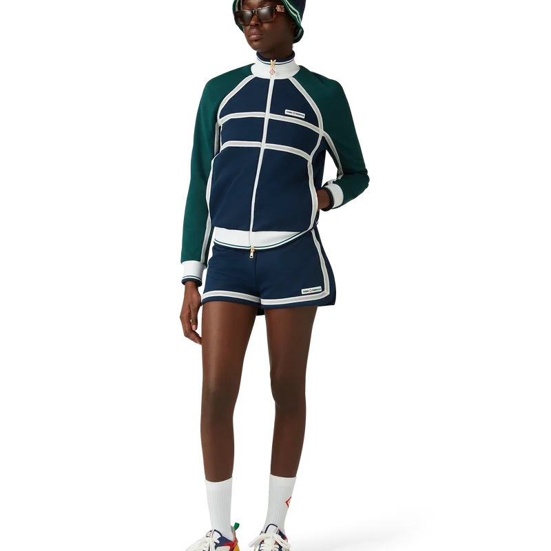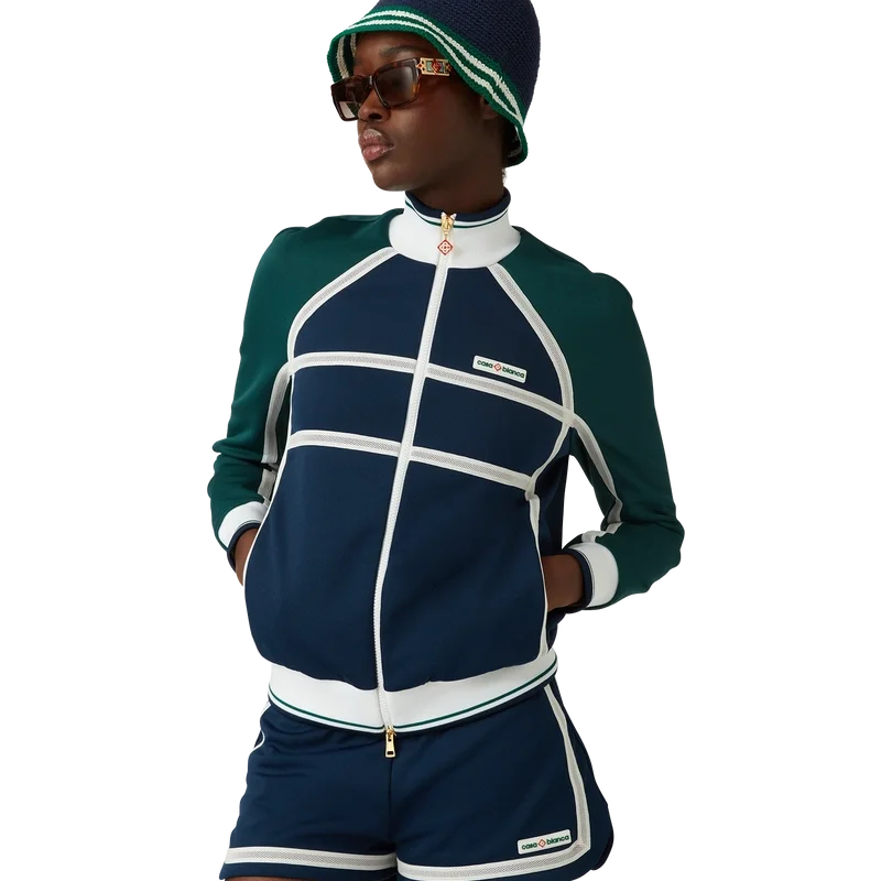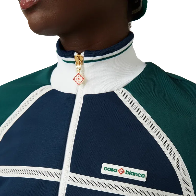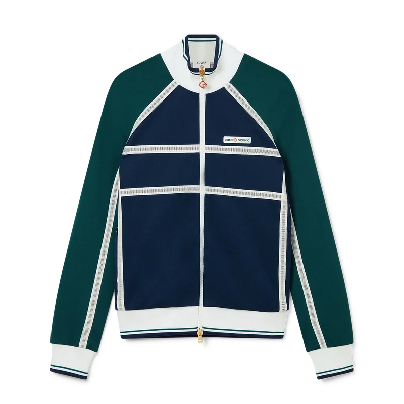 Het Mesh Tape Track Jacket is een op sportkleding geïnspireerd ontwerp, vervaardigd uit tricotstof. Afgewerkt met een ritssluiting, panelen met witte biezen, een geribde kraag, manchetten en zoom met streepdetails, zijzakken, mesh tape-detail en het kenmerkende Casablanca-logo van het huis.