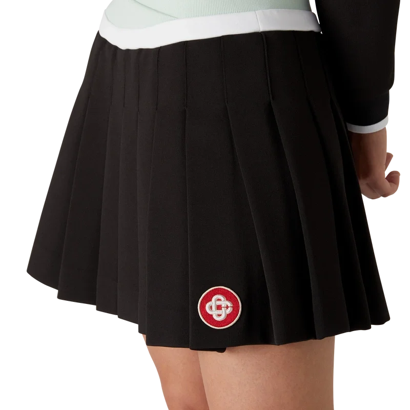 De Scuba geplooide minirok is een kort model met een A-lijn silhouet, voorzien van het kenmerkende diamantlogo van het huis, vervaardigd uit viscose. Afgewerkt met een overlappende, groen-witte gebreide tailleband en een geplooid paneel.