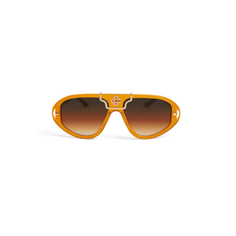 De opvallende oranje & gouden acetaatconstructie van de Hacienda-zonnebril kenmerkt deze rechthoekige montuurzonnebril. Hier is het kenmerkende Casablanca-Diamond Monogram-logo op de neusbrug geplaatst. De Sunset-gradiëntglazen bieden 100% UV-bescherming en het model wordt geleverd met een Casablanca-doos, reinigingsdoekje en garantieboekje.