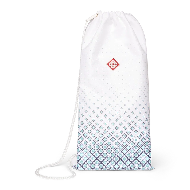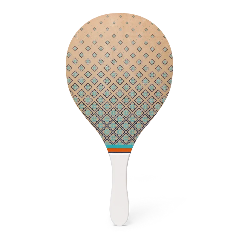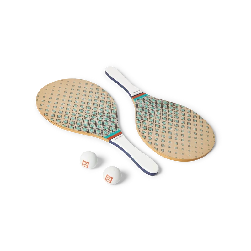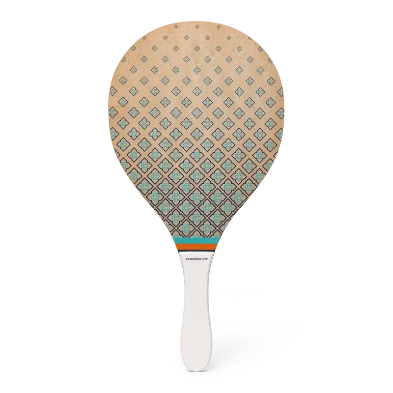 De strandrackets en -ballen zijn vervaardigd uit multiplex en verf op oliebasis en zijn voorzien van de kenmerkende monogramprint in kleurverloop van het huis op de slagvlakken. Afgewerkt met mintgroene, oranje en marineblauwe strepen op de keel, een wit handvat en twee rubberen ballen met het merk. Afmetingen: 19,2 cm (breedte) x 39 cm (van de bovenrand van de voorkant tot de onderkant van het handvat) en wordt geleverd met een eigen opbergtas met riem en het merk.