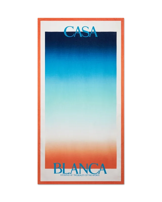 De Gradient strandhanddoek is een bedrukt ontwerp, vervaardigd van katoenen badstof met de kleurverloopprint van dit seizoen. Afgewerkt met het gestapelde logo van het huis en een marineblauwe rand.