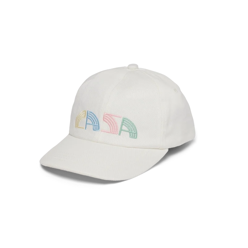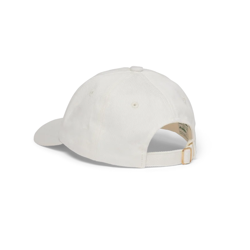 De gebroken witte Casa Deco-pet met borduursel is voorzien van de dubbele branding van de samenwerking. Afgewerkt met een verstelbare gouden klittenbandsluiting aan de achterkant.
