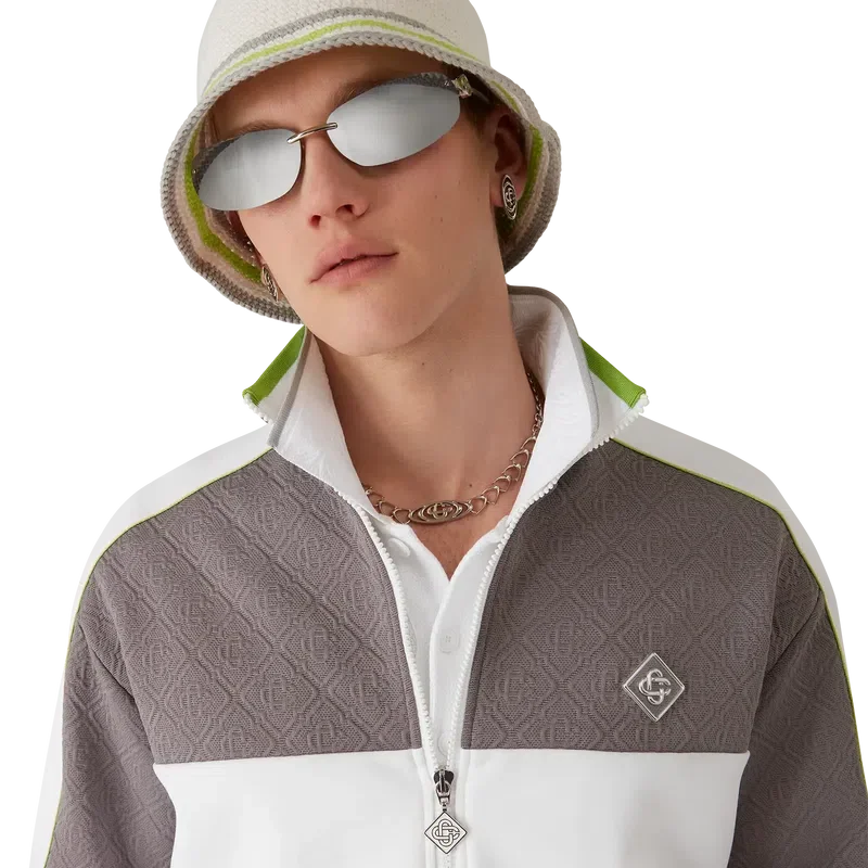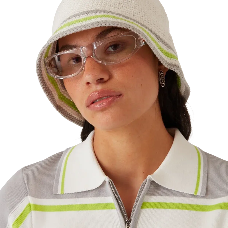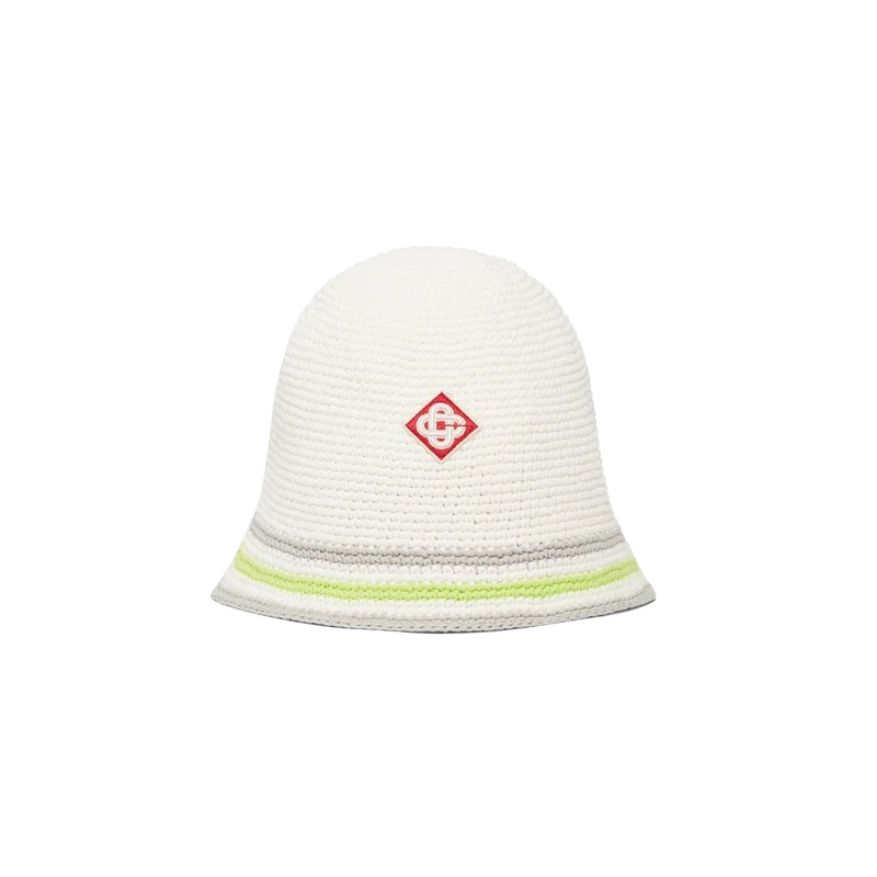 De gestreepte gehaakte hoed heeft een klassiek bucket-silhouet en is gemaakt van zacht, open geweven gehaakt katoen – de ultieme zomerse must-have. Afgewerkt met een groen, grijs en wit gestreepte rand en een Casablanca-logo-applicatie in het midden.