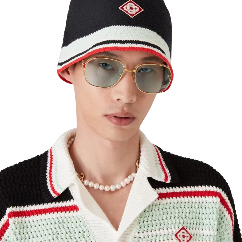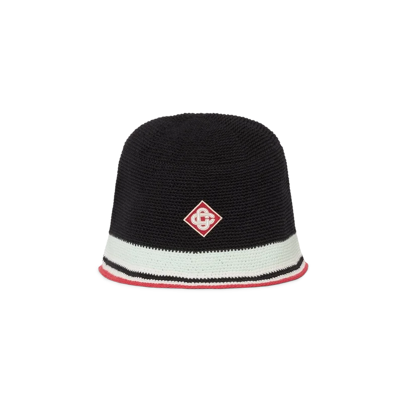 De gestreepte gehaakte hoed is een bucket-model, vervaardigd van een zacht, open geweven gehaakt katoen met textuur – de ultieme zomerse must-have. Afgewerkt met een blauw, rood, mintgroen en wit gestreepte rand en een Casablanca Diamond Monogram-applicatie in het midden.