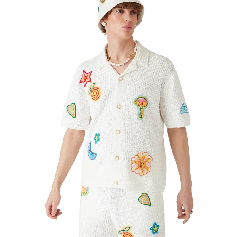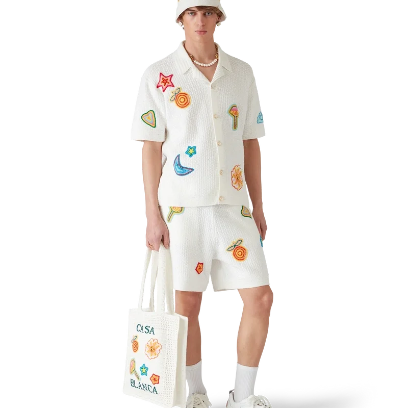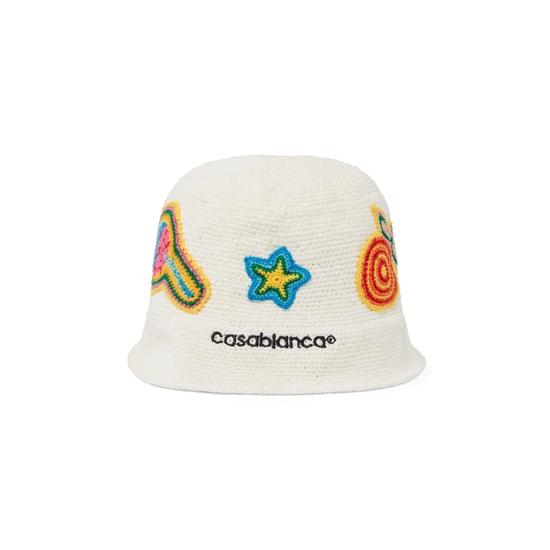 De Motif gehaakte hoed is een bucket-model, vervaardigd van een zacht gestructureerde, open geweven gehaakte katoenen stof – de ultieme zomerse must-have. Afgewerkt met een rand, een geborduurd Casablanca-logo en applicaties van de klassieke ontwerpelementen van het huis in het midden.