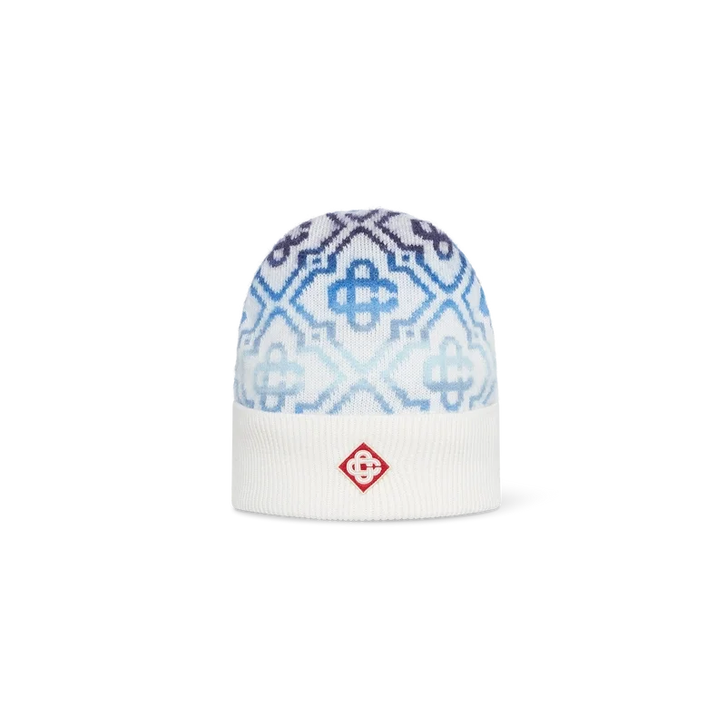 De Space Dye Monogram Beanie is vervaardigd uit een luxueuze wolmix met het kenmerkende monogram van het huis in een blauw kleurverloop op de kroon, gemaakt van space-dyed garens die diepte en dimensie creëren. Afgewerkt met een geribbelde rand en het kenmerkende Diamond Monogram van het huis in het midden.