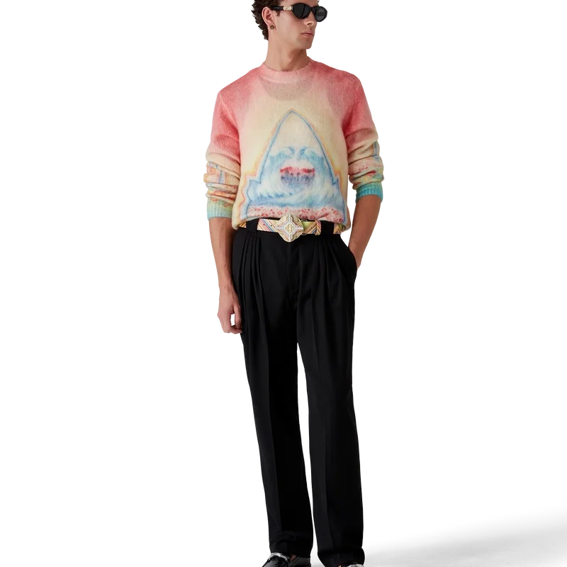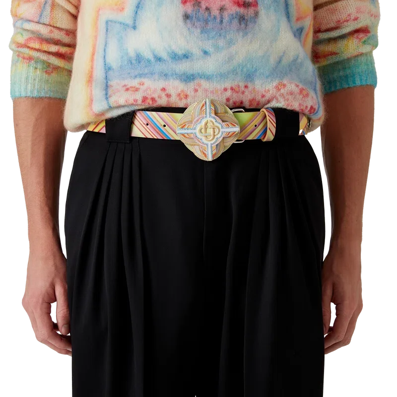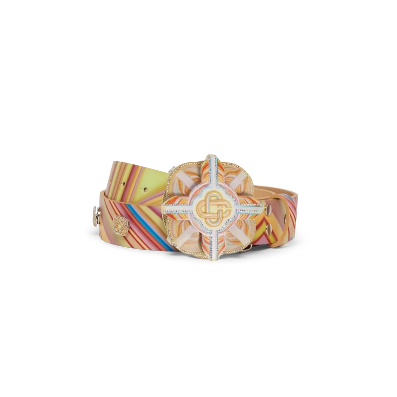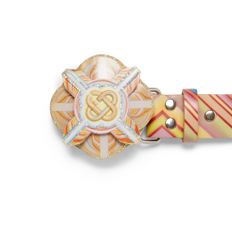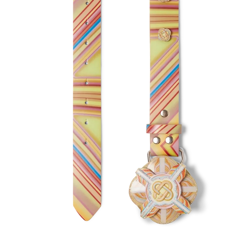 De Low Rider-riem is een veelkleurig ontwerp dat verwijst naar de popkleuren en airbrush-schildertechnieken die worden gebruikt op Low Rider-auto’s. Afgewerkt met het Casablanca-logo over de lengte van de riem en op de gesp, een spinner-schijf en kristallen.