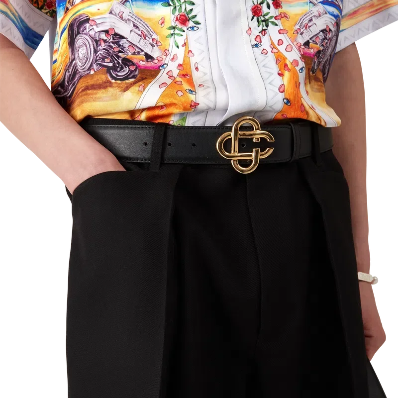 De zwarte Cc-logo riem heeft een band gemaakt van Italiaans geitenleer. Afgewerkt met de kenmerkende in elkaar grijpende Cc-gesp van het huis, vervaardigd uit verguld messing.