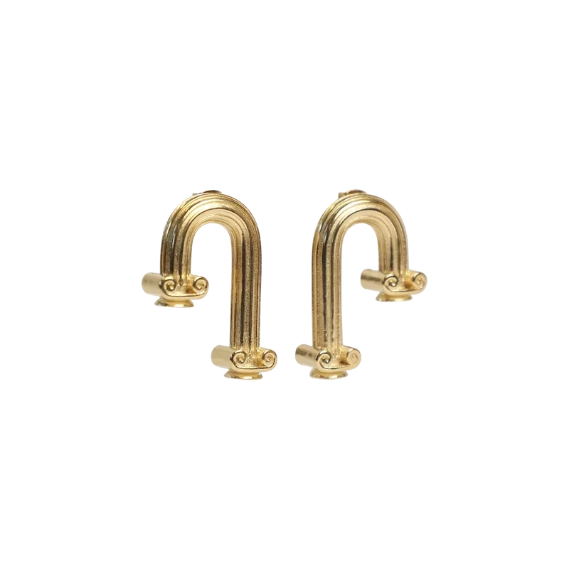 De Arch Column-oorbellen ademen het Oudgriekse thema van dit seizoen. Vervaardigd uit vervormde Griekse zuilen in verguld messing. Ontworpen voor gaatjes in de oren.