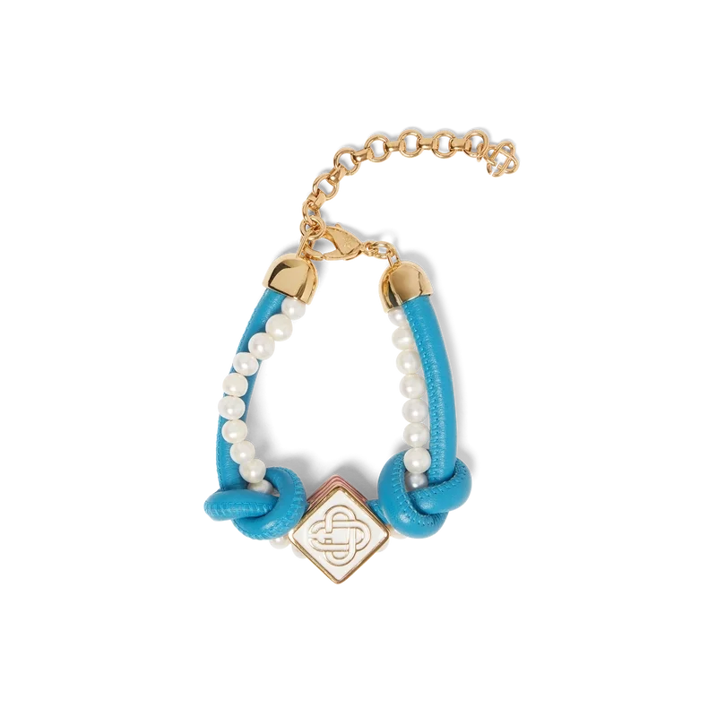 De blauwe geknoopte parelarmband is vervaardigd uit leer en zoetwaterparels en is voorzien van het kenmerkende diamantlogo van het huis. Afgewerkt met een vergulde karabijnsluiting en ketting.<!–