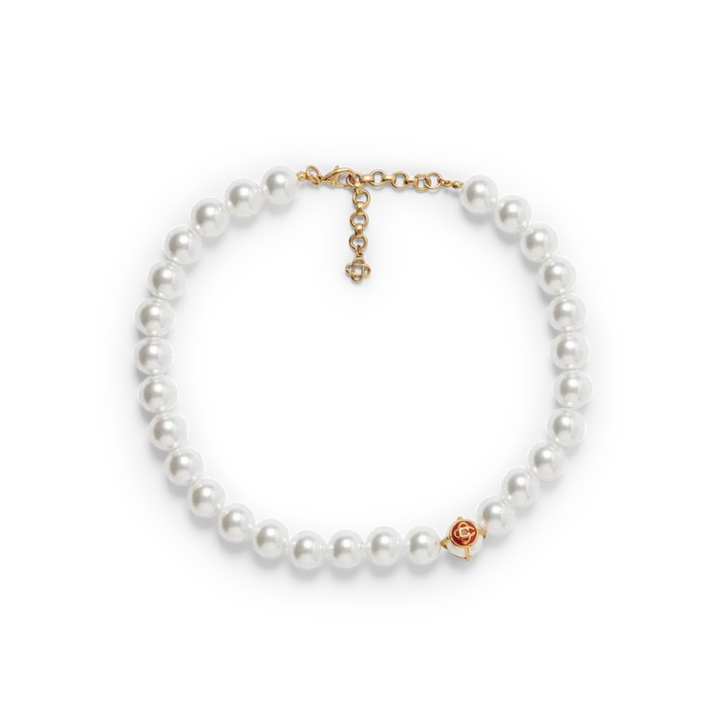 De Caged Pearl-ketting is vervaardigd uit verguld messing en imitatieglasparels en is voorzien van het kenmerkende diamantlogo van het huis. Afgewerkt met een vergulde ketting en een karabijnsluiting. Dit sieraad wordt geleverd met een geschenkdoos, een stofzakje met merklogo en een boekje met productdetails.