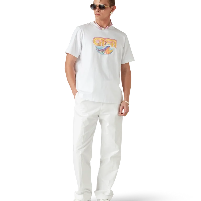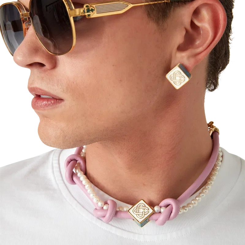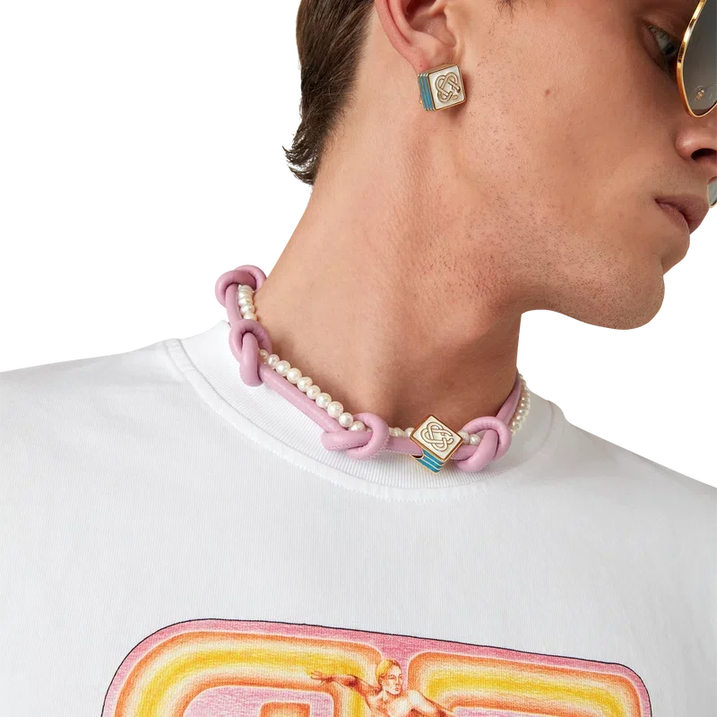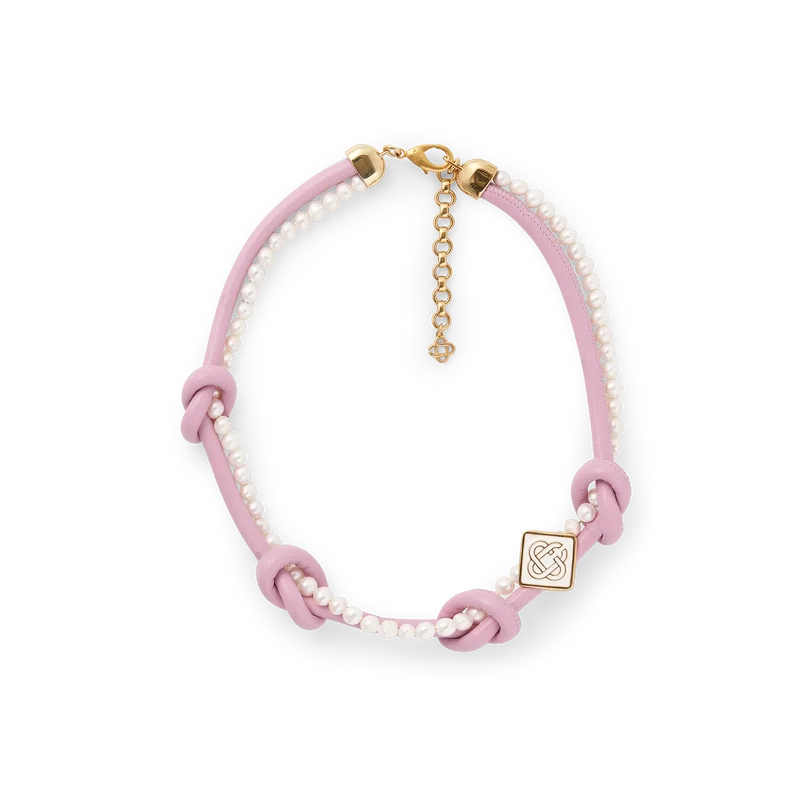 De roze geknoopte ketting is vervaardigd uit leer en zoetwaterparels en is voorzien van het kenmerkende diamantlogo van het huis. Afgewerkt met een vergulde karabijnsluiting en ketting.<!–