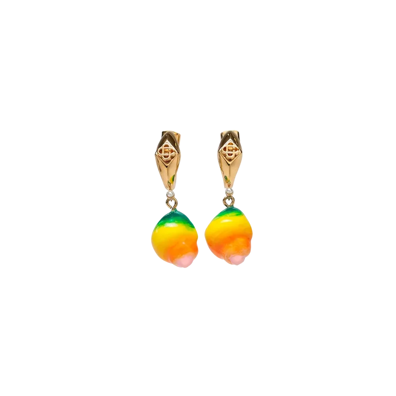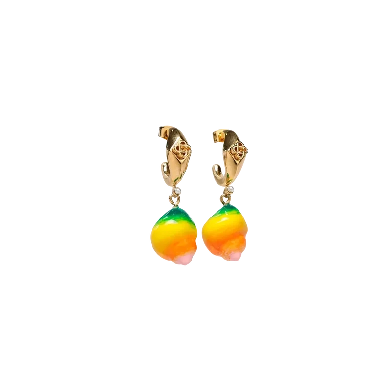 De schelp-oorbellen zijn vervaardigd uit vergulde messing ringen met het in elkaar grijpende CC-logo van het huis en mini-schelpjes met een regenboogkleurig kleurverloop. Afgewerkt met glazen parels.