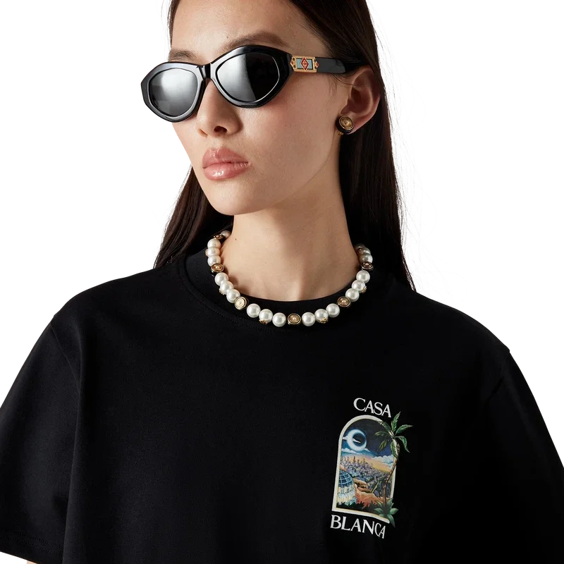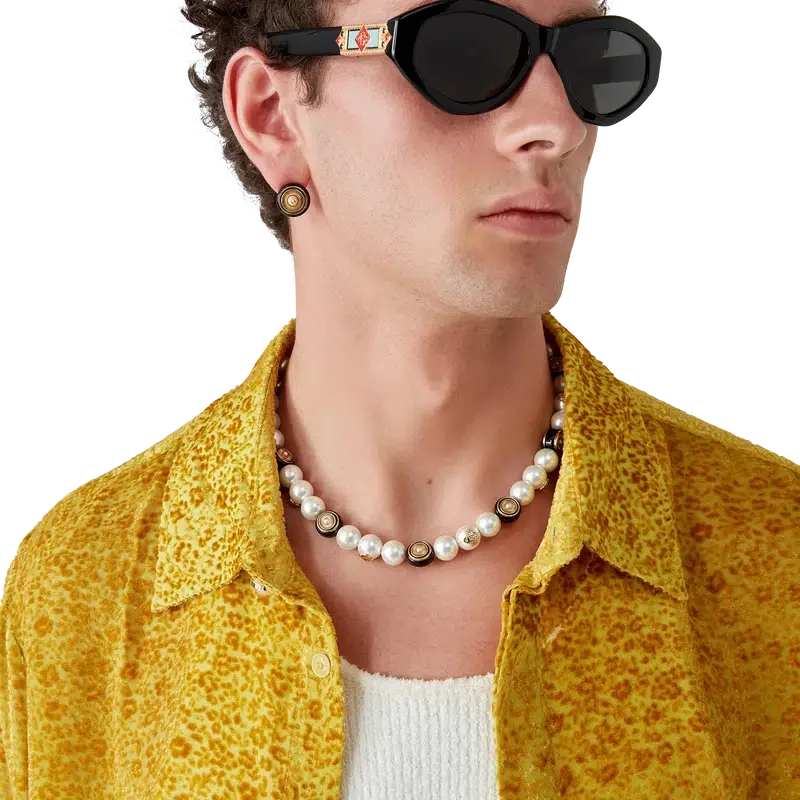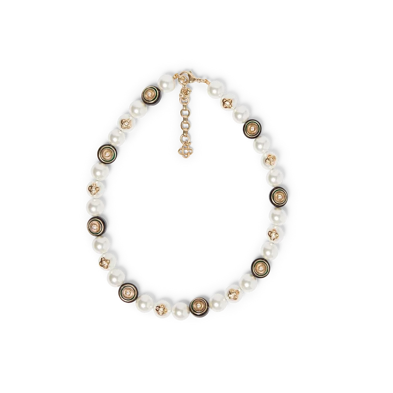De Spoke Wheel-ketting is vervaardigd uit verguld messing, email en zoetwaterparels. Afgewerkt met het in elkaar grijpende CC-logo van het huis, een vergulde ketting en een karabijnsluiting.