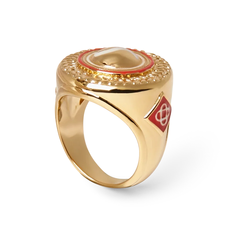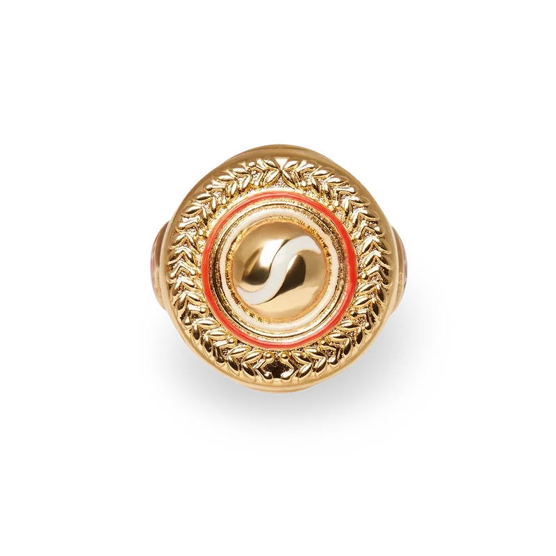 De Sport Medallion Ring is vervaardigd uit verguld messing en email en is voorzien van het kenmerkende diamantlogo van het huis op de zijkanten en bladmotieven op de voorkant.