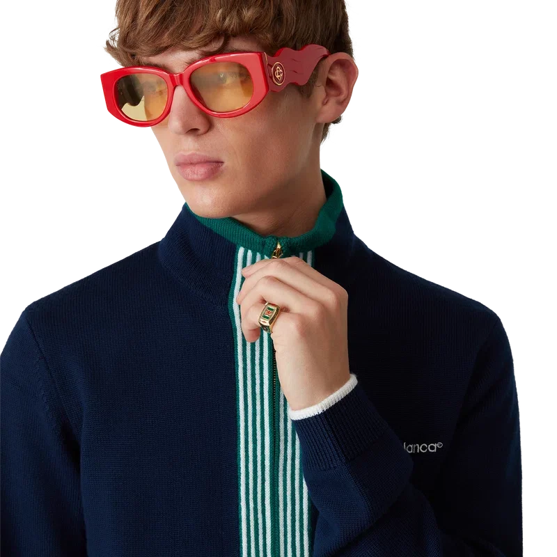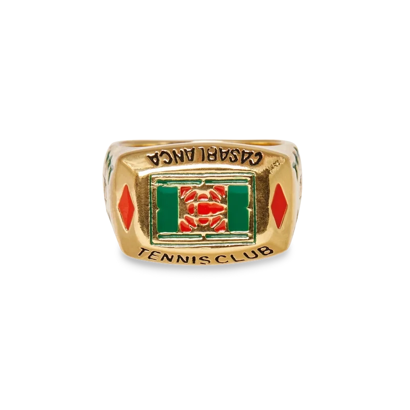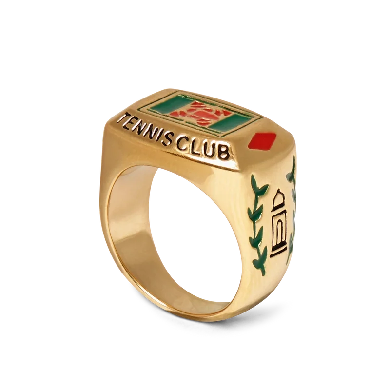 De Tennis Club-ring is vervaardigd uit verguld messing en met de hand beschilderd email. Afgewerkt met bladerdetails en het Casablanca Tennis Club-logo. Dit sieraad wordt geleverd met een geschenkdoos, een stofzakje en een boekje met productdetails.