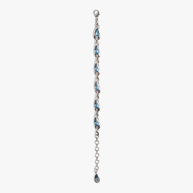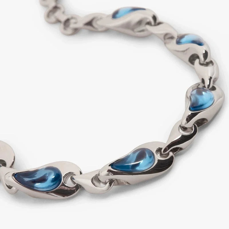 De zilveren en blauwe waterdruppelarmband is een elegant ontwerp, vervaardigd uit messing en hars, met een delicaat waterdruppelmotief in zilver- en blauwtinten. Afgewerkt met een verfijnde verzilverde schakelconstructie voor een verfijnde finishing touch.