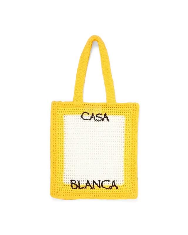 De gehaakte tas is een geel-witte tas, ontworpen om een zomerse outfit compleet te maken. De tas is gemaakt van 100% katoen en heeft een slouchy silhouet met een geborduurd zwart logo en hengsels waarmee de tas als draagtas over de schouder of in de hand gedragen kan worden.