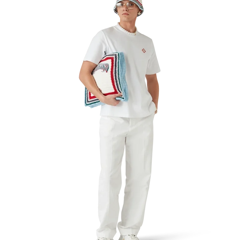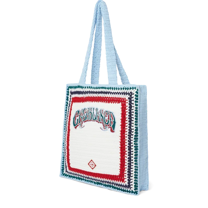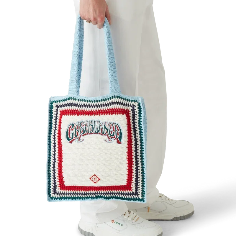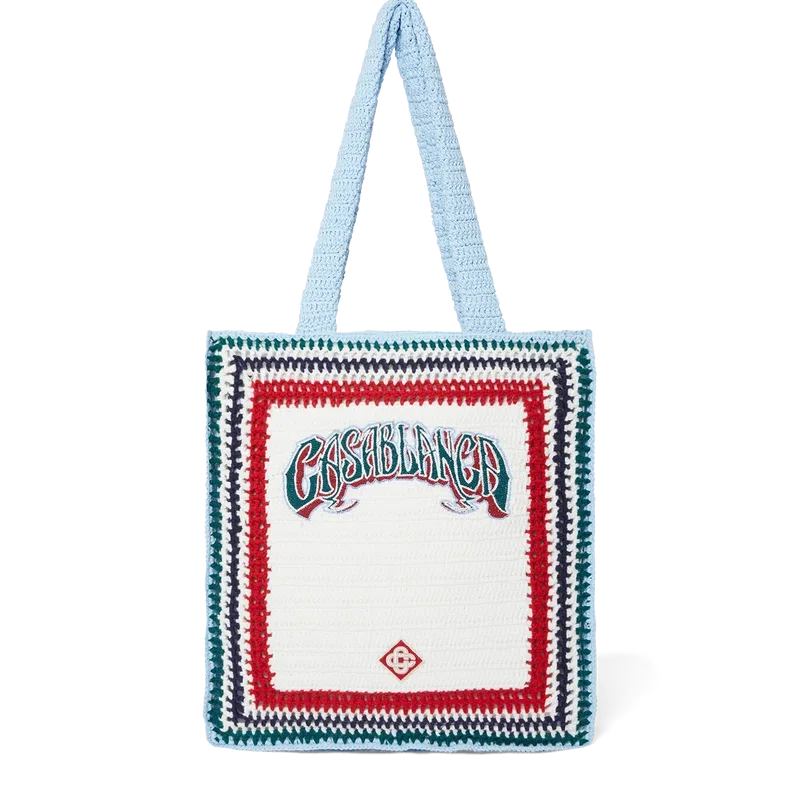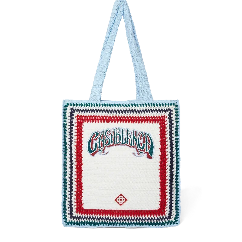 De Gothic Crochet Bag is een gebreide tas, vervaardigd van gehaakt katoen, met een slouchy silhouet. Afgewerkt met geborduurde, handgetekende typografie van het Casablanca-logo, geïnspireerd op het gotische lettertype dat vaak in tatoeages wordt gebruikt, en hengsels waarmee de tas zowel over de schouder als in de hand gedragen kan worden.