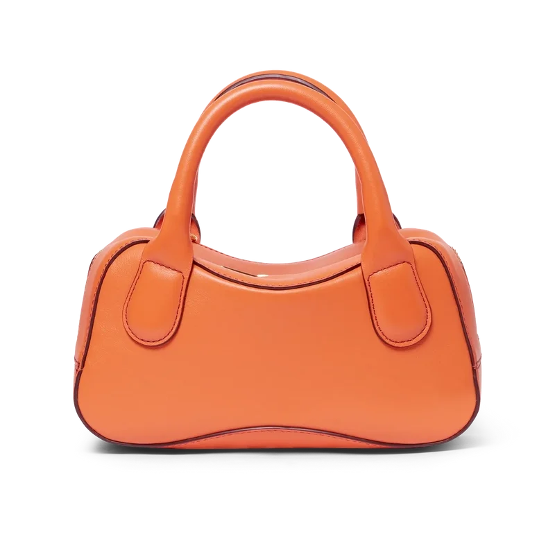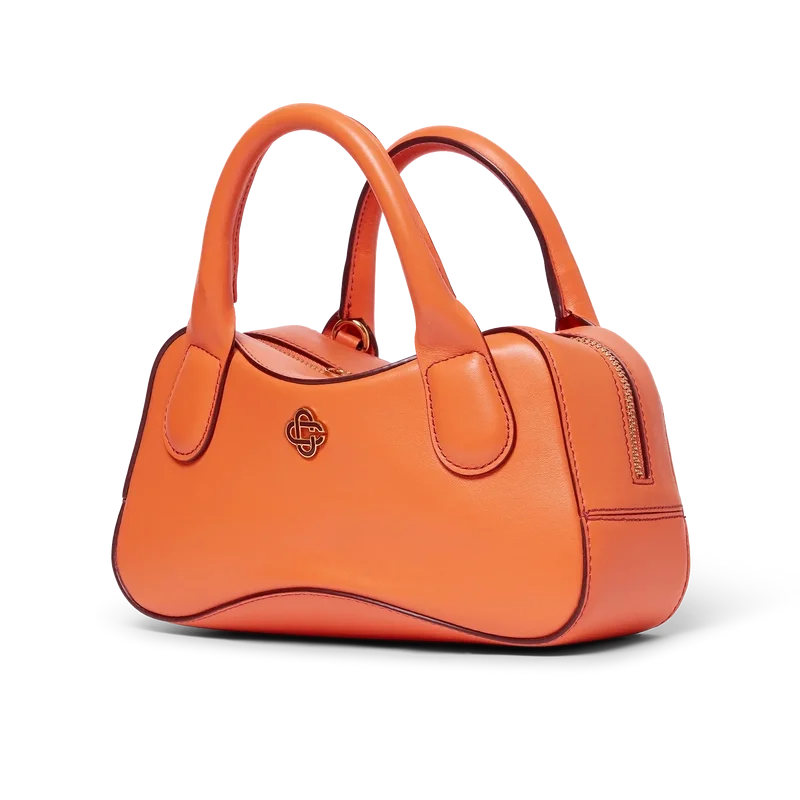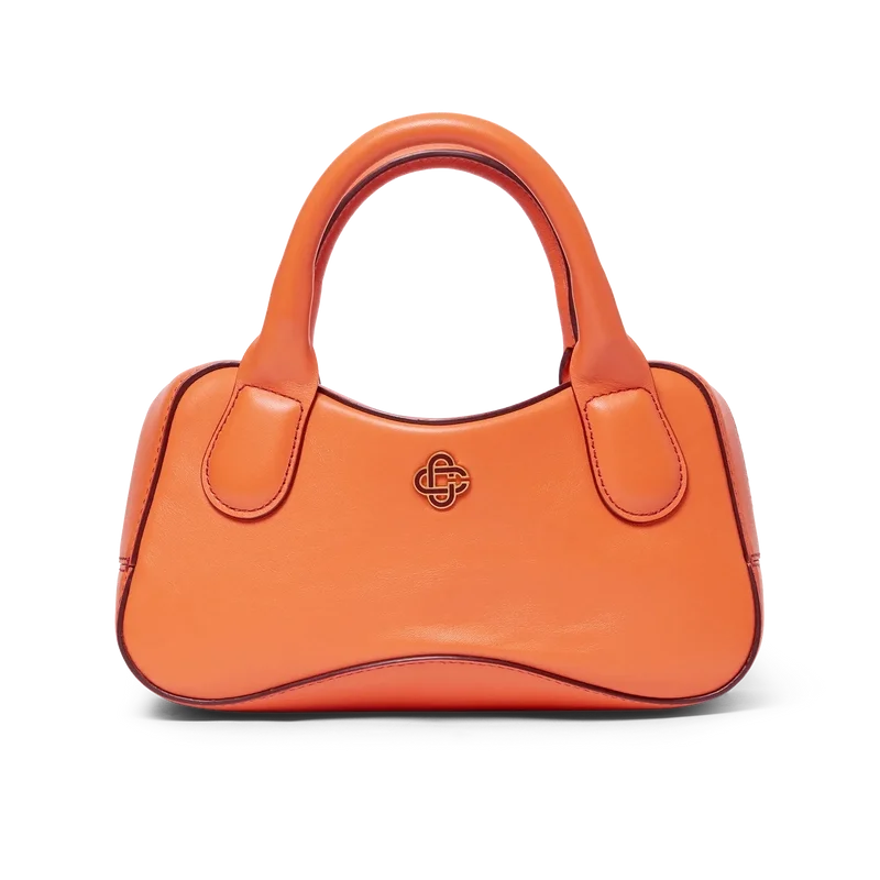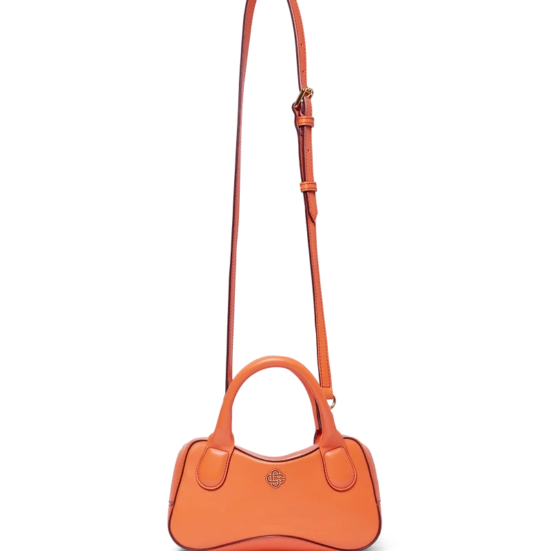 De oranje micro-bowlingtas is vervaardigd uit Italiaans kalfsleer en versierd met het in elkaar grijpende CC-logo van het huis op hoogwaardige metalen hardware. Afgewerkt met een ritssluiting, een verstelbare, afneembare riem, twee handvatten en een intern steekvak. Geleverd met een stofzak met Casablanca-logo, een geschenkdoos en een productinformatieboekje.