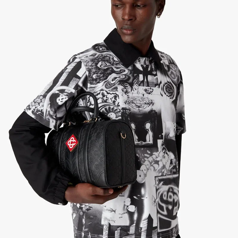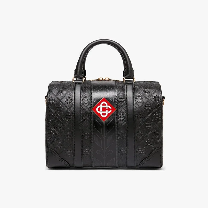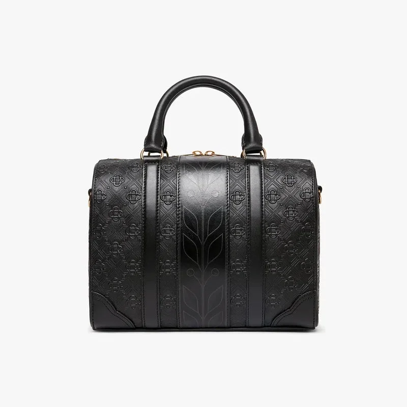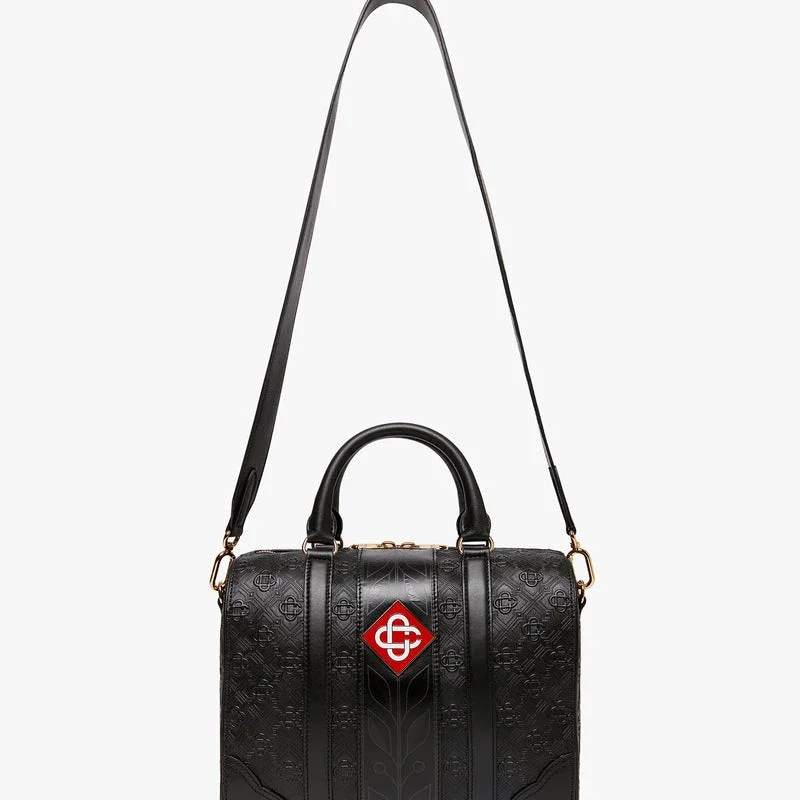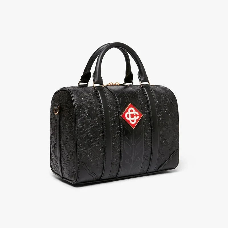 De zwarte Mini Monogram Weekender-tas is vervaardigd uit Italiaans leer en versierd met het kenmerkende diamantlogo van het huis op de zijkant. Afgewerkt met het kenmerkende laurierbladmotief van het huis, handvatten, een ritssluiting, een schouderriem, een binnenvak en messing beslag. Geleverd met een geschenkdoos van het merk Casablanca, een stofzak en een productinformatieboekje.