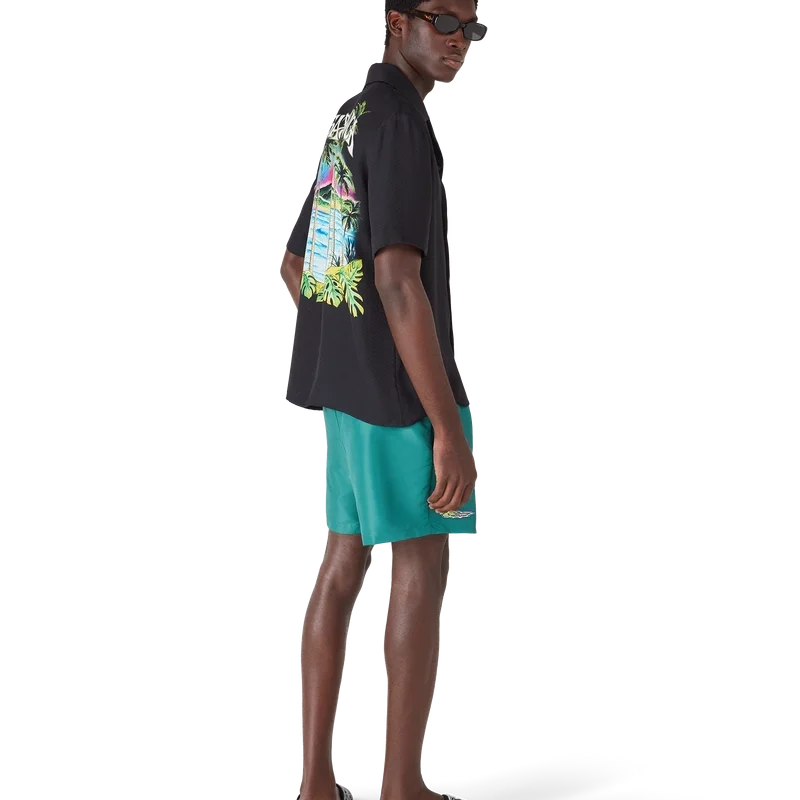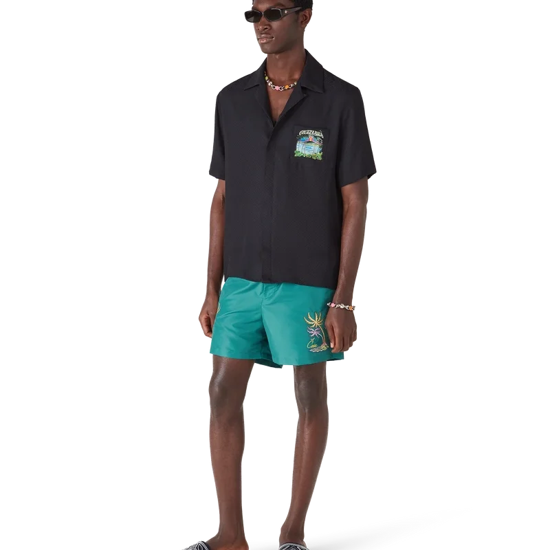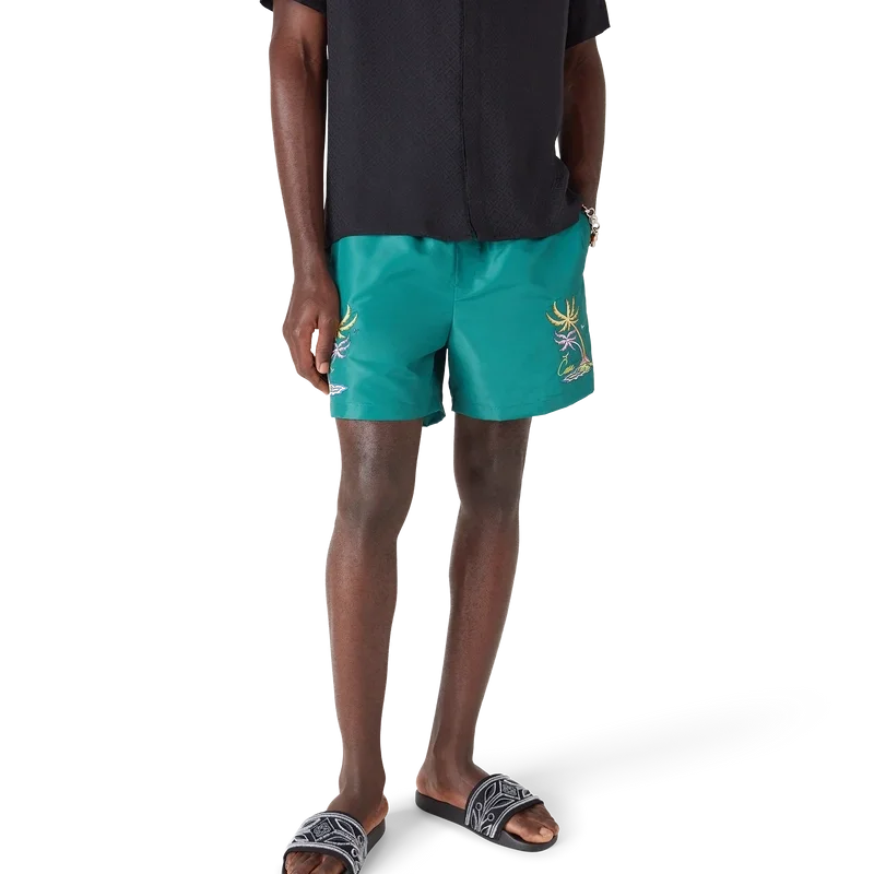 De Casa Embroidery zwemshort is voorzien van kleurrijke palmbomen die dansen in de zeewind, weergegeven in nauwkeurig borduurwerk dat de ritmische beweging van tropisch gebladerte vastlegt. Afgewerkt met een elastische tailleband, zijzakken en een technische zwemstofconstructie die de verfijnde benadering van het huis op het gebied van luxe badmode belichaamt.