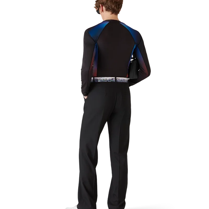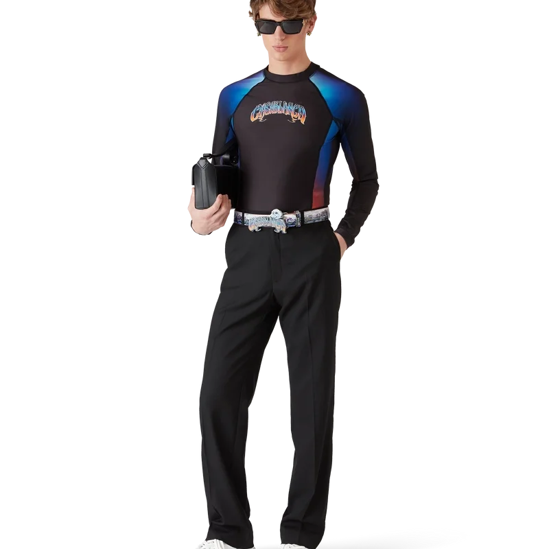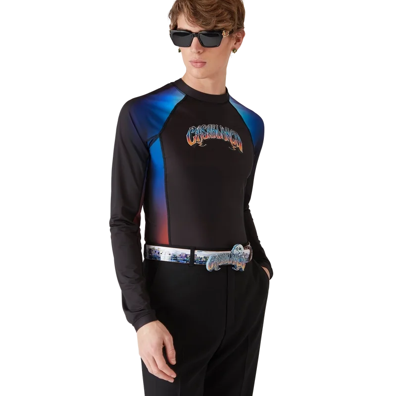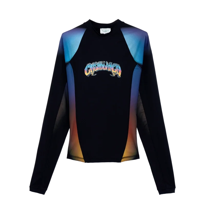 Het Gradient Rash Vest is een nauwsluitend shirt met lange mouwen en een print in de kleurverloopkleuren van dit seizoen, vervaardigd uit zwemstof. Afgewerkt met een handgetekende typografie van het Casablanca-logo, geïnspireerd op het gotische lettertype dat in tatoeages wordt gebruikt, een hoge hals en zijkanten en mouwpanelen met kleurverloop.