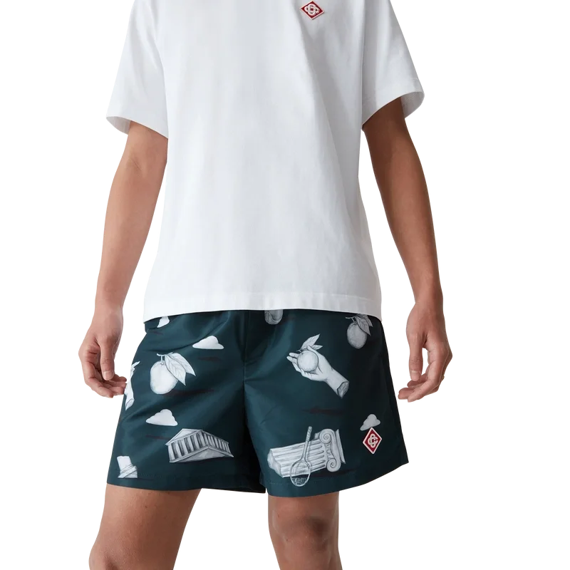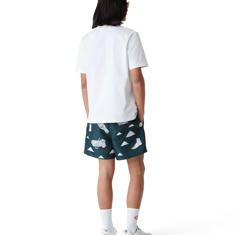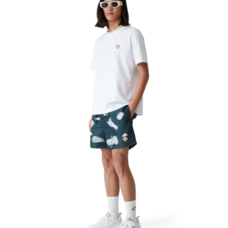 De Metaphysical zwemshort heeft een klassiek ontwerp en is gemaakt van een technische polyesterstof met het kenmerkende diamantlogo van het huis en een herhalend trompe-l’oeil-patroon met steeneffect en subtiele tekeningen van de belangrijkste ontwerpelementen. Afgewerkt met een elastische tailleband, een intern trekkoord, zijzakken in de naad, een voering en een binnenzak.