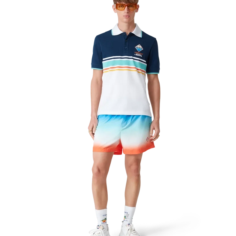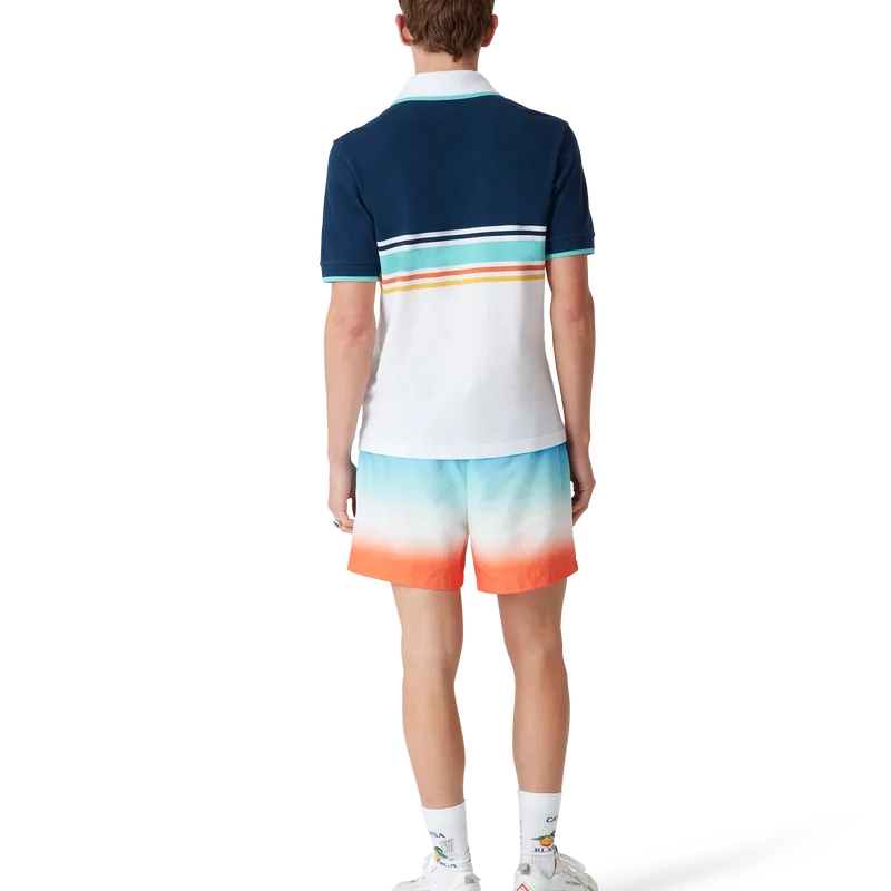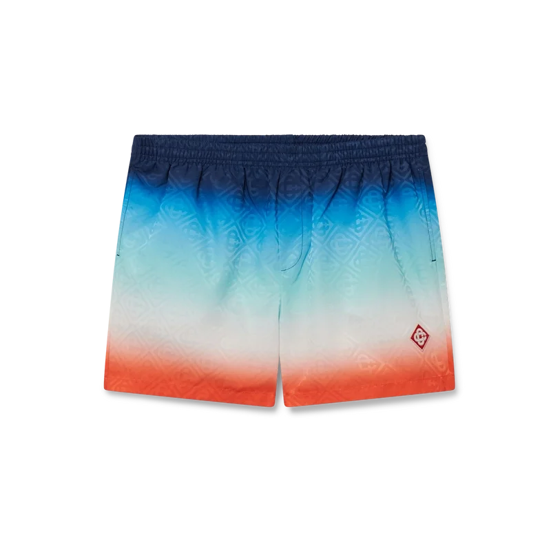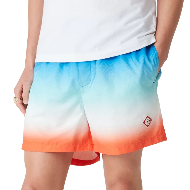 De Gradient Jacquard zwemshort is een model met all-over print, gekenmerkt door een ingetogen kleurenpalet van blauw, aqua, wit en oranje in een kleurverloop dat speciaal voor de collectie is ontworpen, vervaardigd uit een technische stof. Afgewerkt met een elastische tailleband met een interne trekkoordsluiting, zijzakken in de naad, een binnenzak en een voering.