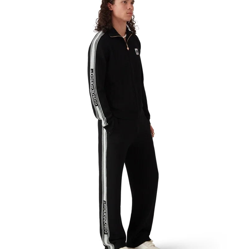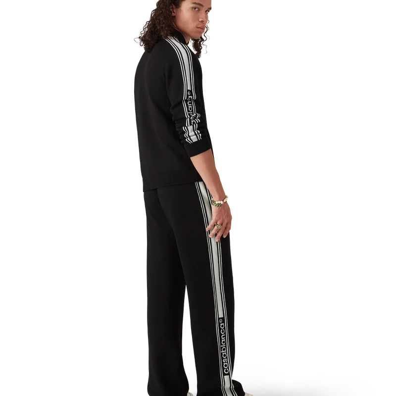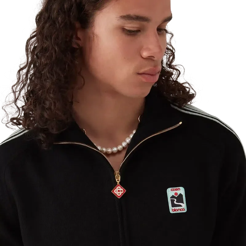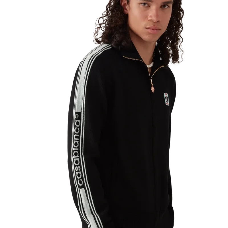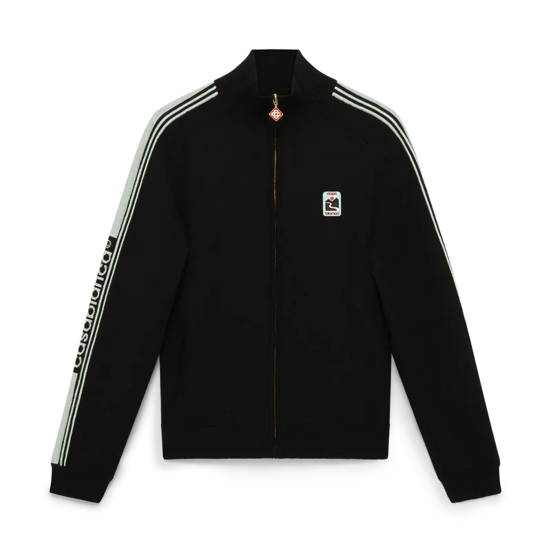 Het Merino gebreide trainingsjack is een ontwerp met lange mouwen, vervaardigd van merinowol. Afgewerkt met een ritssluiting, contrasterende knoopsluiting, een polo-hals, streepdetails langs de mouwen, geribde manchetten en zoom, en een Casablanca-logo.