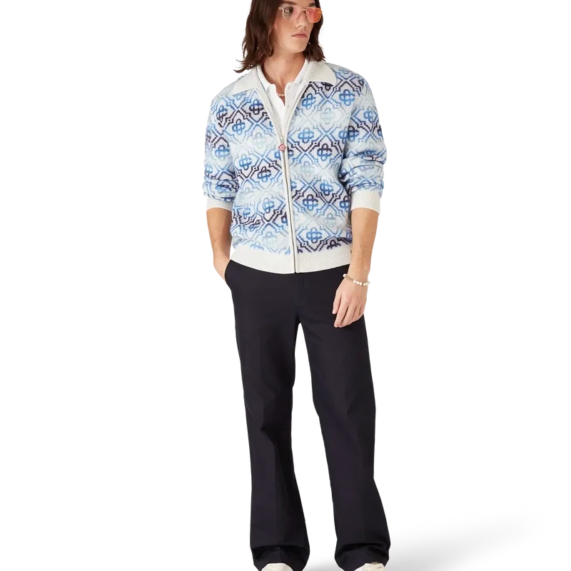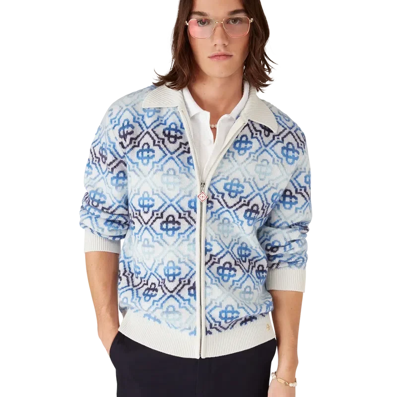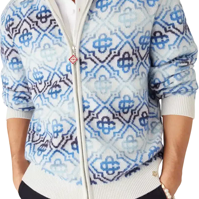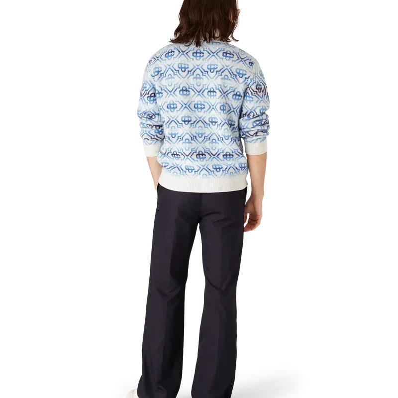 Het Space Dye Monogram Merino-vest met lange mouwen is een verfijnd gebreid ontwerp met het kenmerkende monogram van het huis in een blauw kleurverloop, vervaardigd uit space-dyed garens die diepte en dimensie creëren. Afgewerkt met een ritssluiting met het kenmerkende Diamond Monogram-logo op het ritslipje, en geribde details bij de kraag, manchetten en zoom.