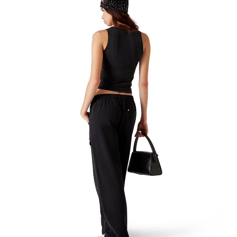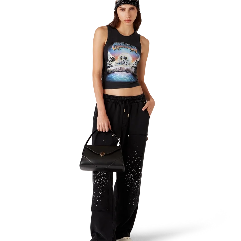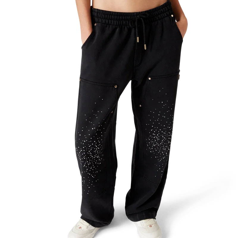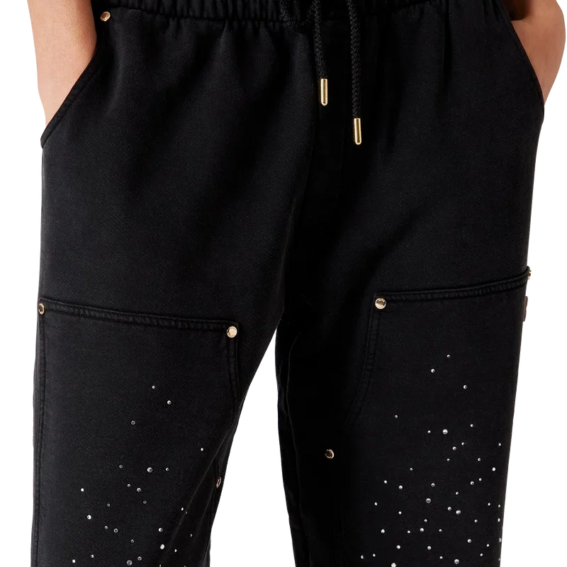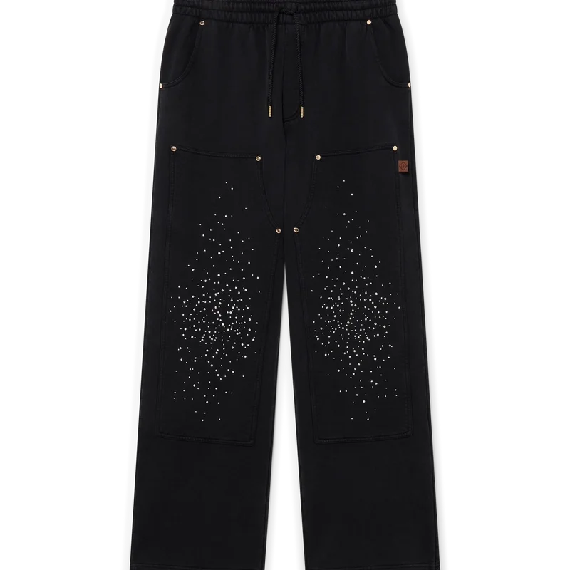 De La Pramonition-joggingbroek met kristallen versieringen is vervaardigd van bedrukte biologische katoen en hotfix-glaskralen. Afgewerkt met een elastische tailleband met trekkoordsluiting, steekzakken in de zijkanten, een opgestikte achterzak en opgestikte details op de pijpen.