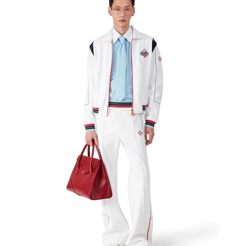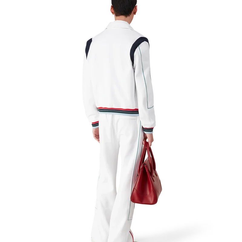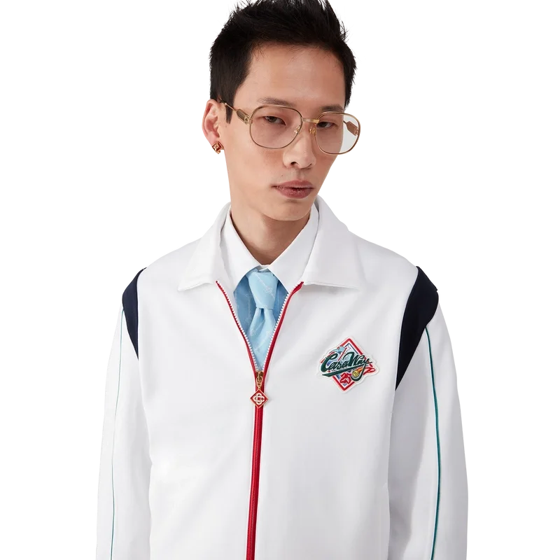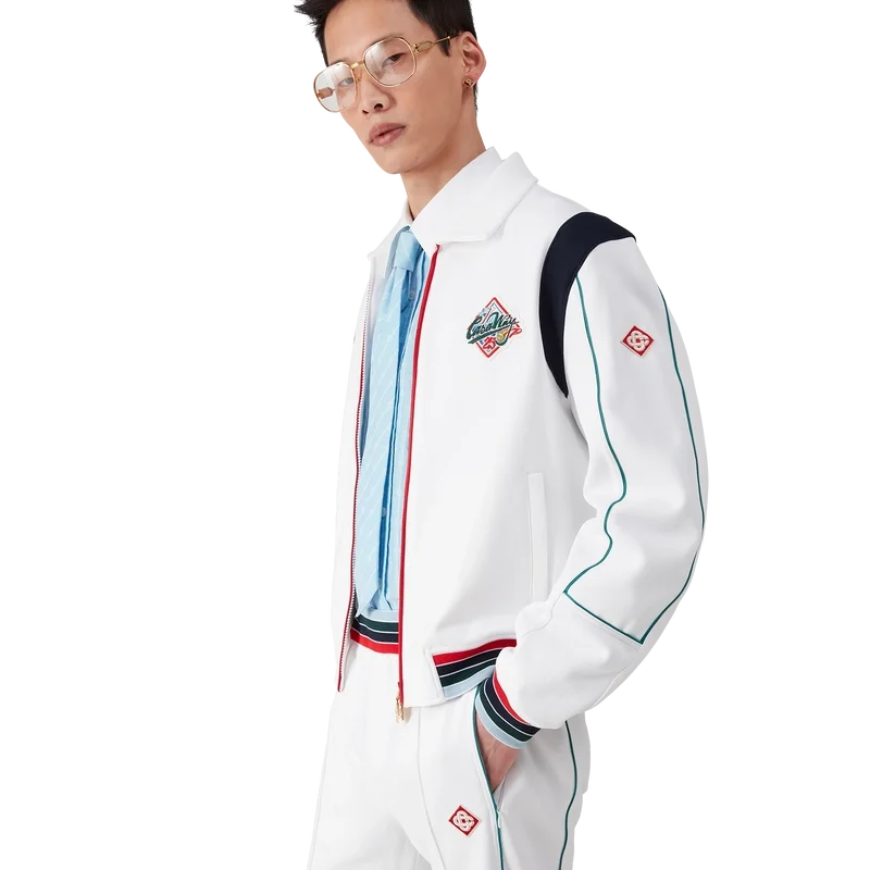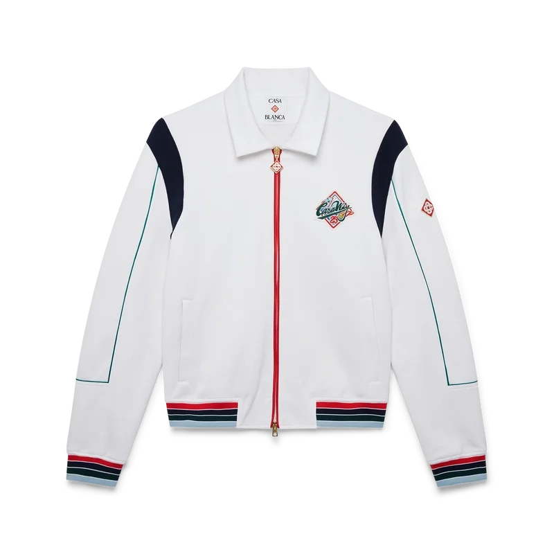 Het Casa Way sportjack is een sportkledingontwerp met lange mouwen, vervaardigd uit tricotstof. Afgewerkt met een geribde kraag, ritssluiting, gestreepte geribde manchetten en zoom, contrasterend schouderpaneel, Casa Way World Series-kunstwerk dat klassieke All-American honkbalinsignes herinterpreteert voor Casa Way Tennis, biezen, kenmerkend diamantlogo, een voering en paspelzakken. Ontworpen om te dragen met de bijpassende Casa Way sportbroek.