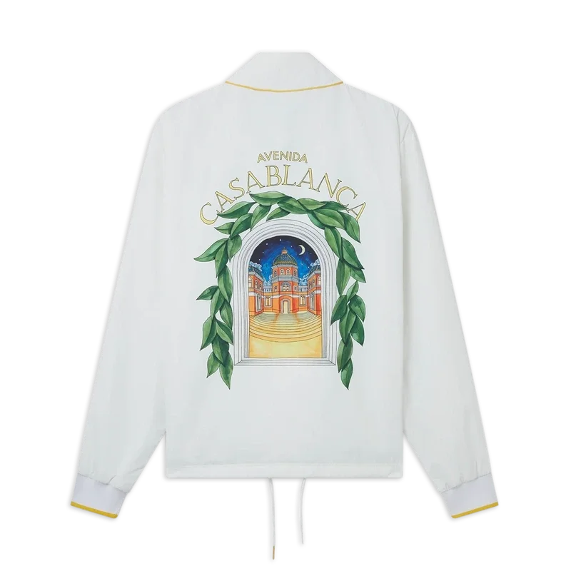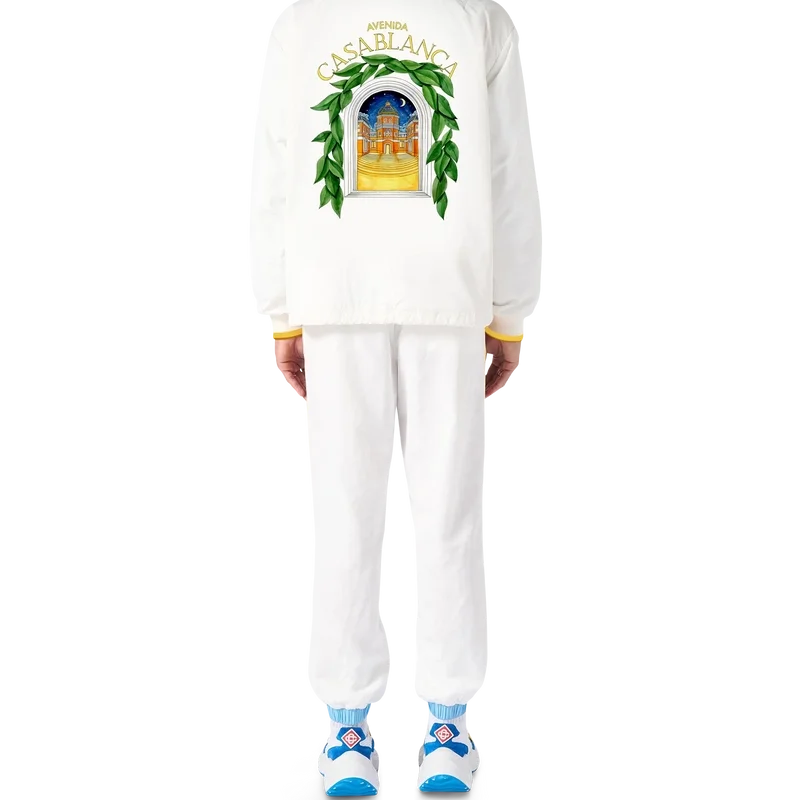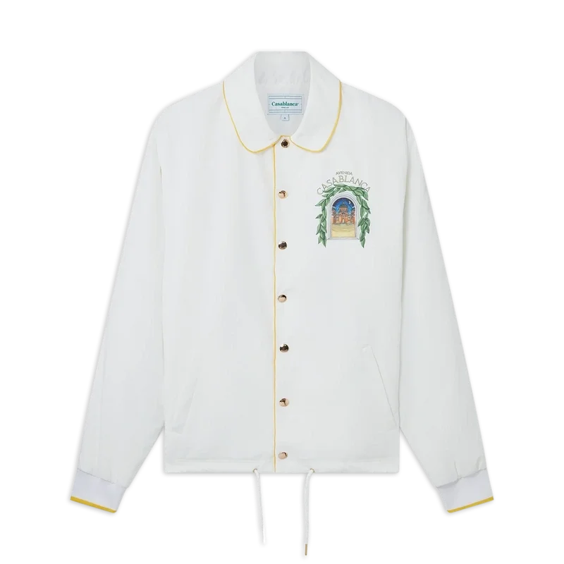 Het Casablanca Avenida Coach-jack in wit is voorzien van een belangrijke seizoensprint waarin de vrije stroom van de natuur samenkomt met de structuur van het door de mens gemaakte ontwerp: de boog, een abstract symbool van kracht. Afgewerkt met een gele ribboord, trekkoorden en een gesloten knoopsluiting.