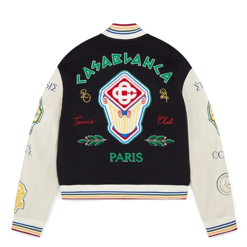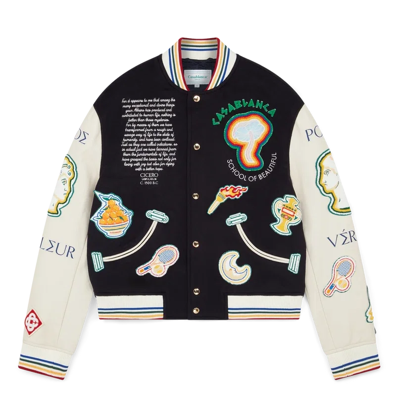 Het Chenille Patchwork Bomberjack is een traditioneel bomberjack met iconografieën uit eerdere collecties, vervaardigd van scheerwol en leer met Griekse letterborduursels die de invloed van het oude Griekenland combineren met futuristische elementen en de kenmerkende ontwerpelementen van het huis, zoals het laurierbladmotief, een tennisracket en -bal, sinaasappels en een fakkel. Afgewerkt met seizoensmotieven uit het oude Griekenland, zakopeningen gevormd door een gebogen Ionische zuil, knoopsluiting met vergulde hardware met merklogo, een geribde opstaande kraag, manchetten en zoom met veelkleurige streepdetails.