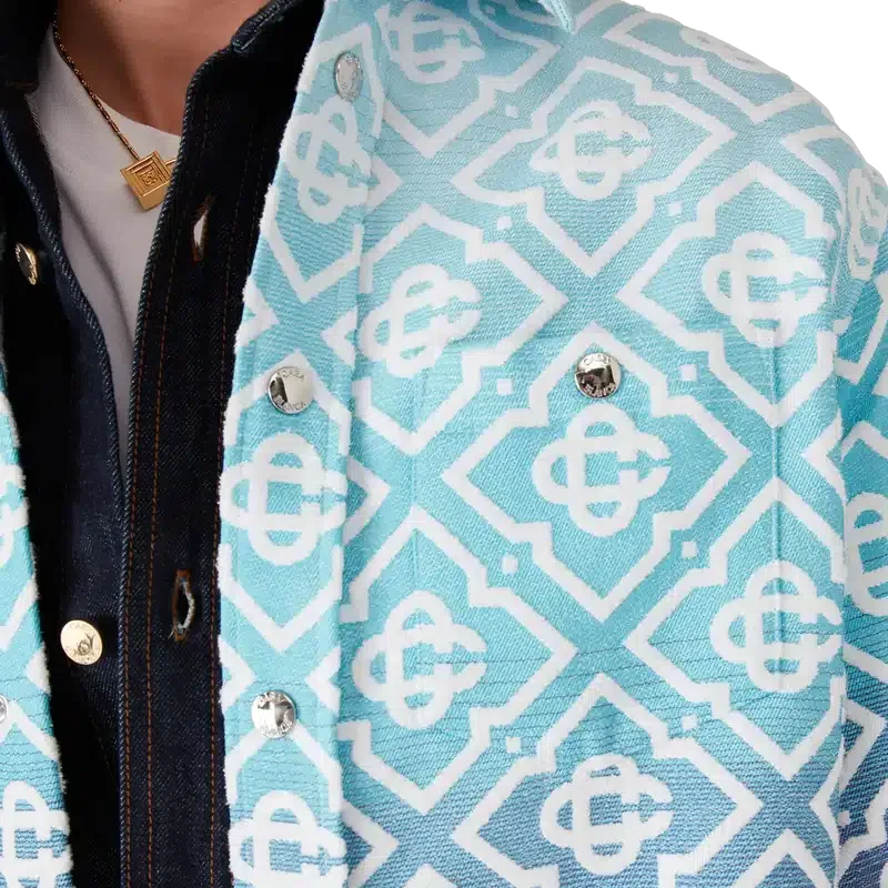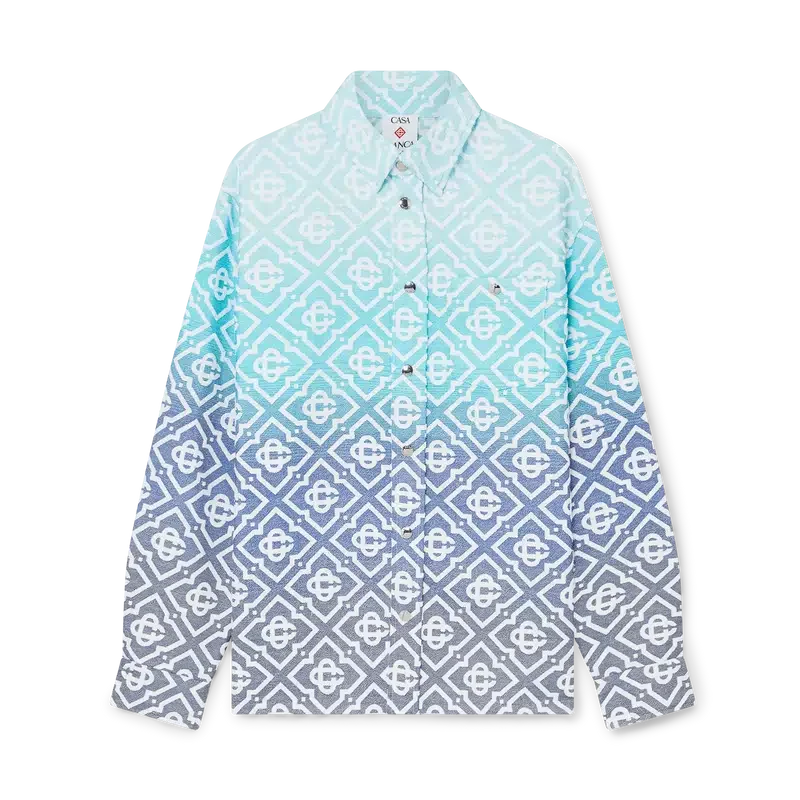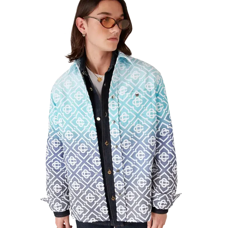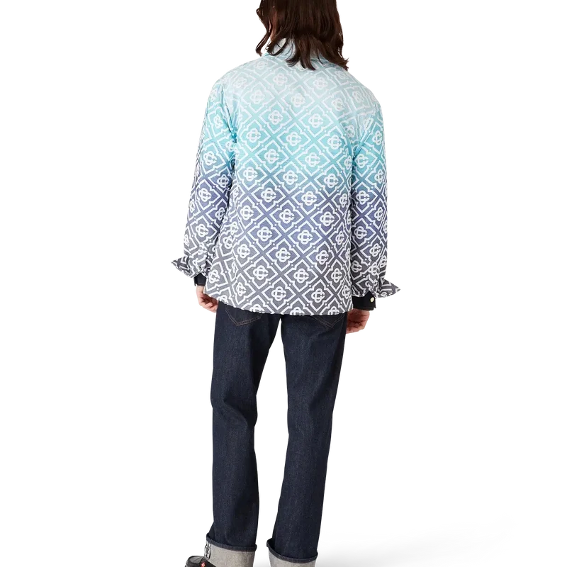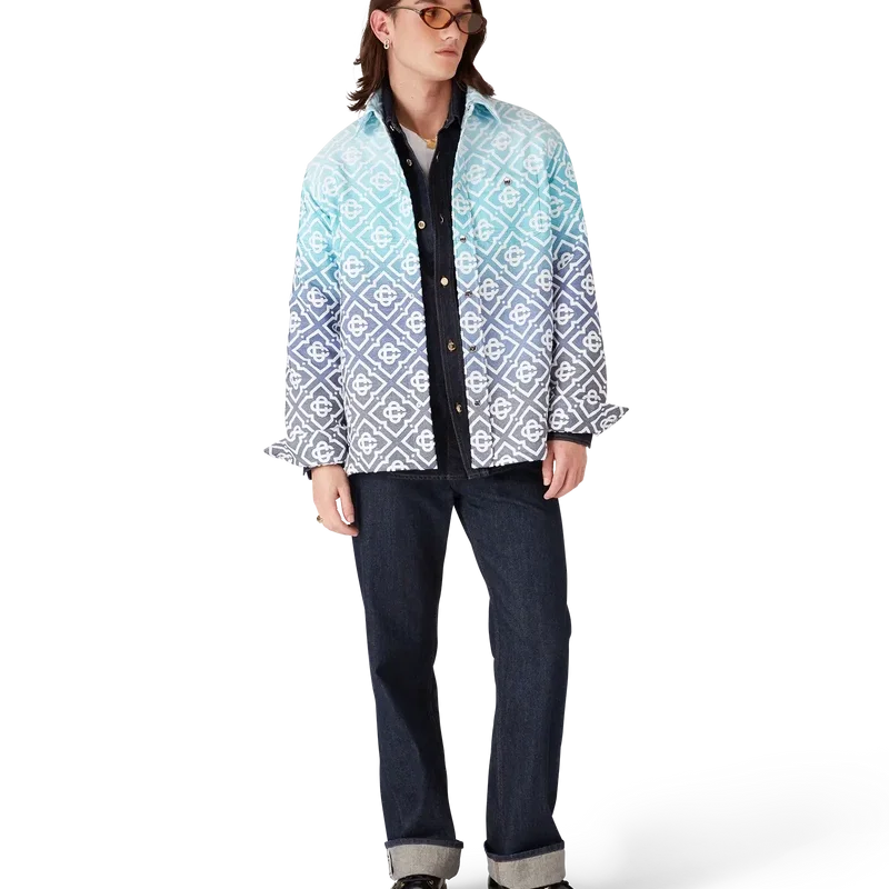 Het Monogram Gradient Jacquard Shacket is een ontwerp met lange mouwen, voorzien van het kenmerkende Monogram van het huis op een achtergrond met kleurverloop. Afgewerkt met een puntkraag, een borstzak, knoopsluiting en verzilverde drukknopen met merklogo.