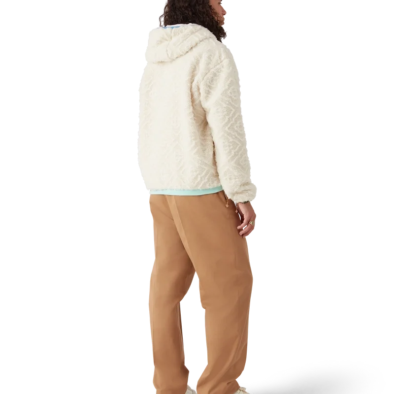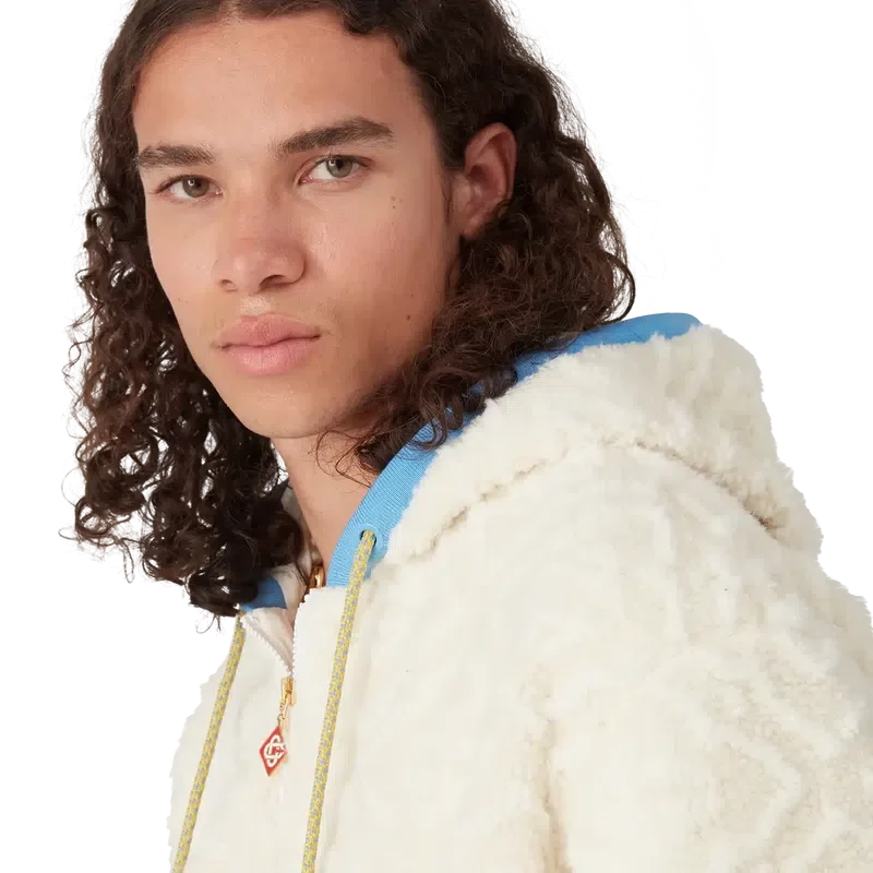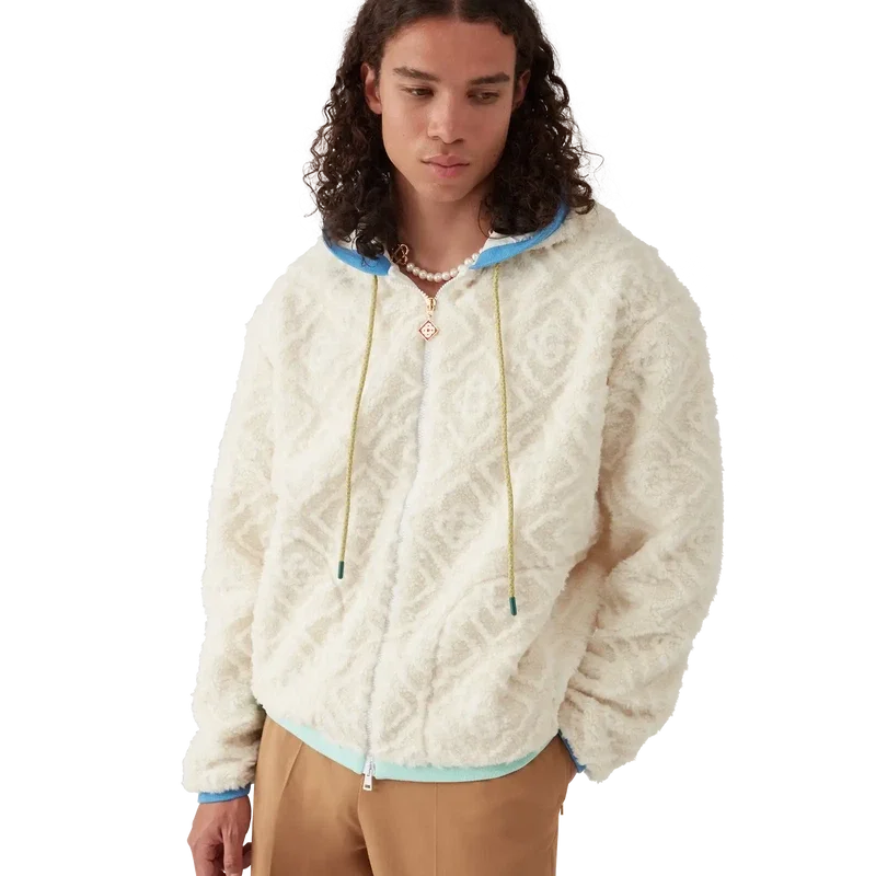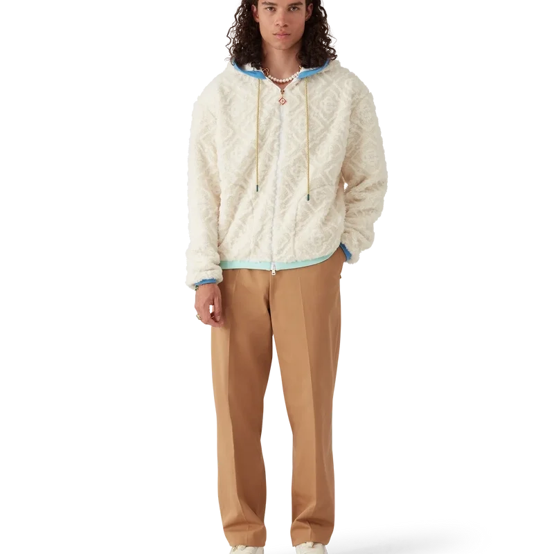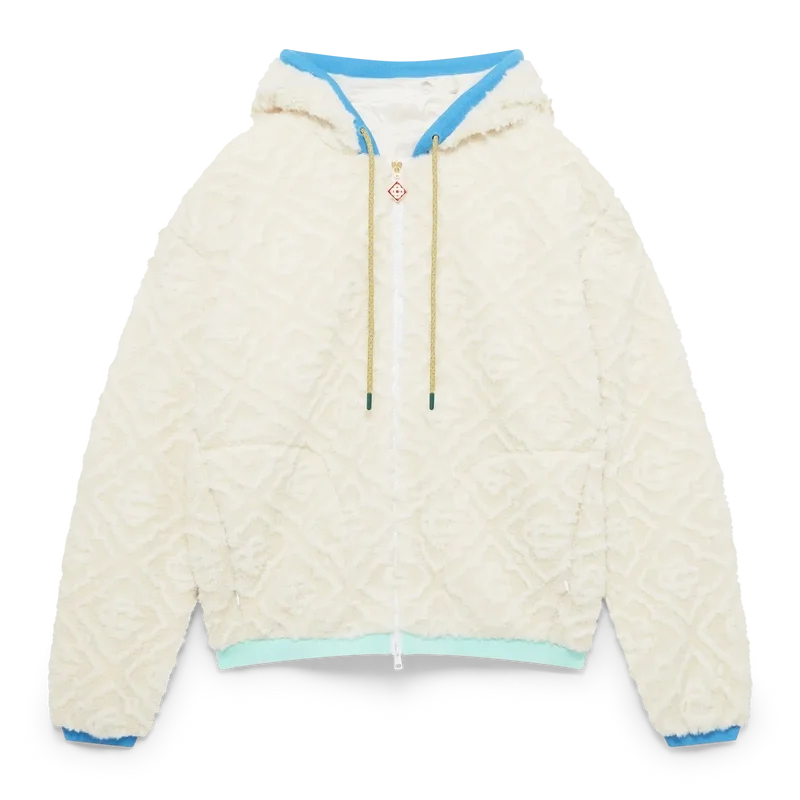 Het Monogram Jacquard fleecejack is een ontwerp met lange mouwen en een zachte textuur, vervaardigd uit fleecestof. Afgewerkt met een capuchon, trekkoordsluiting, ritssluiting met het kenmerkende diamantlogo van het huis op het ritslipje, pastelkleurige geribde manchetten, zoom en randdetails bij de capuchon, en zakken met ritssluiting.