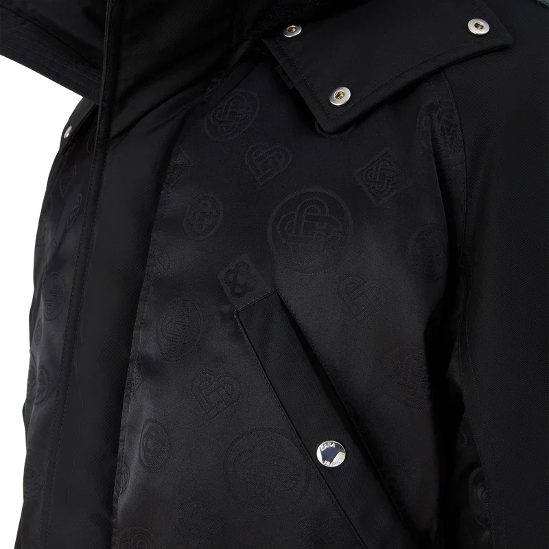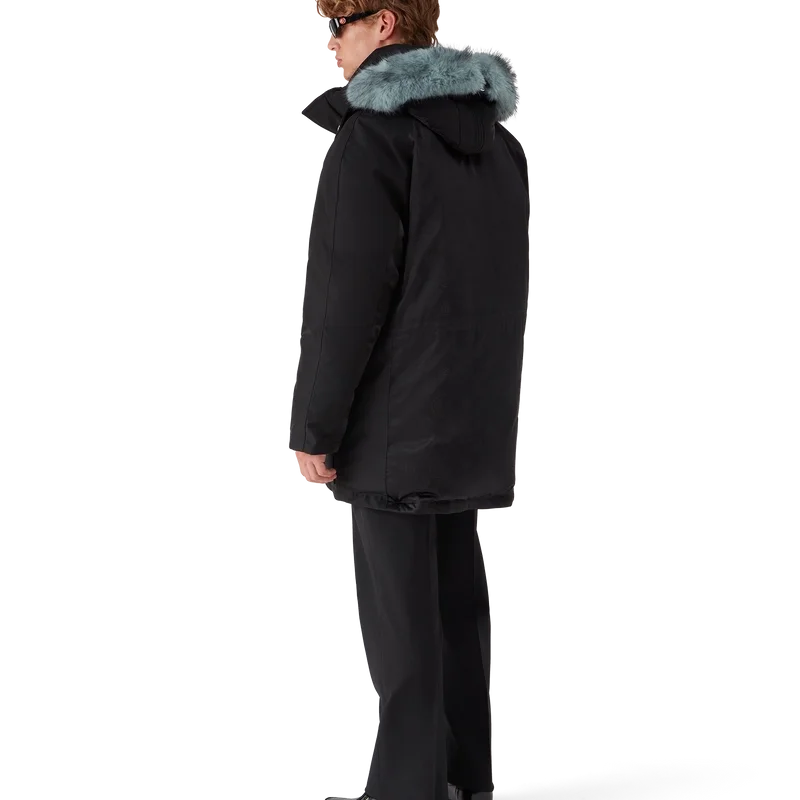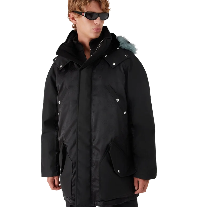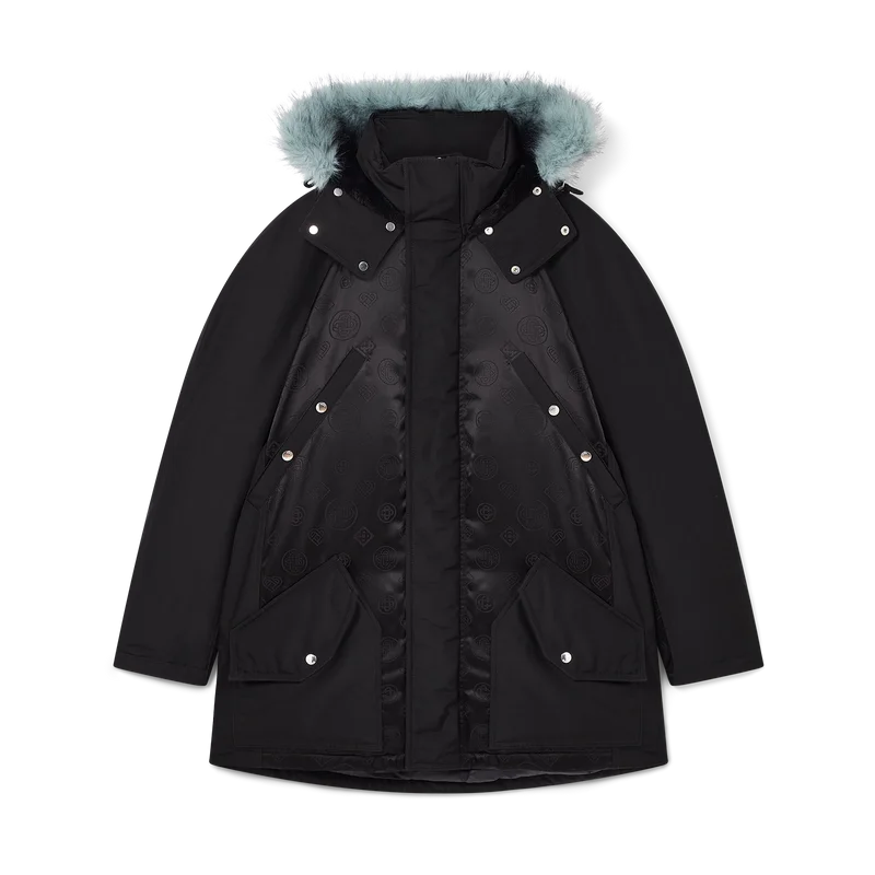 De nylon parka is een Buitenkledingontwerp, vervaardigd van monogramnylon met de Honeydew-print van het huis op een technisch zwart-op-zwarte stof. Afgewerkt met een afneembare capuchon met imitatiebontrand, trekkoordsluiting, ritssluiting, borstzakken en opgestikte zakken met merkhardware, en interne geribde manchetten.