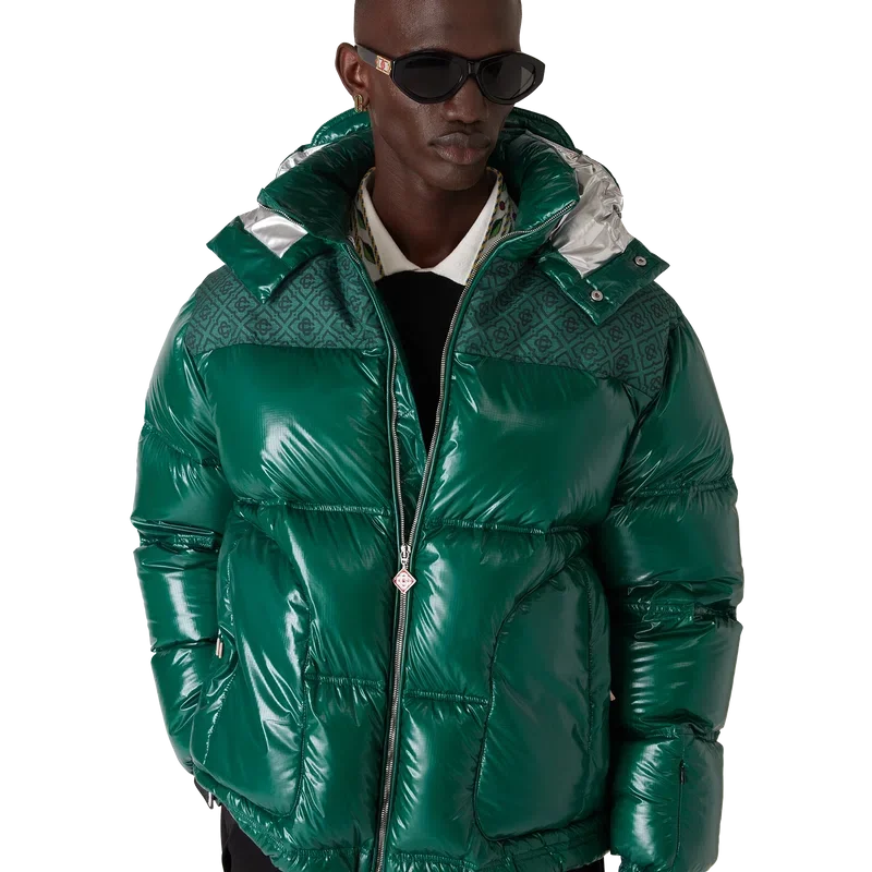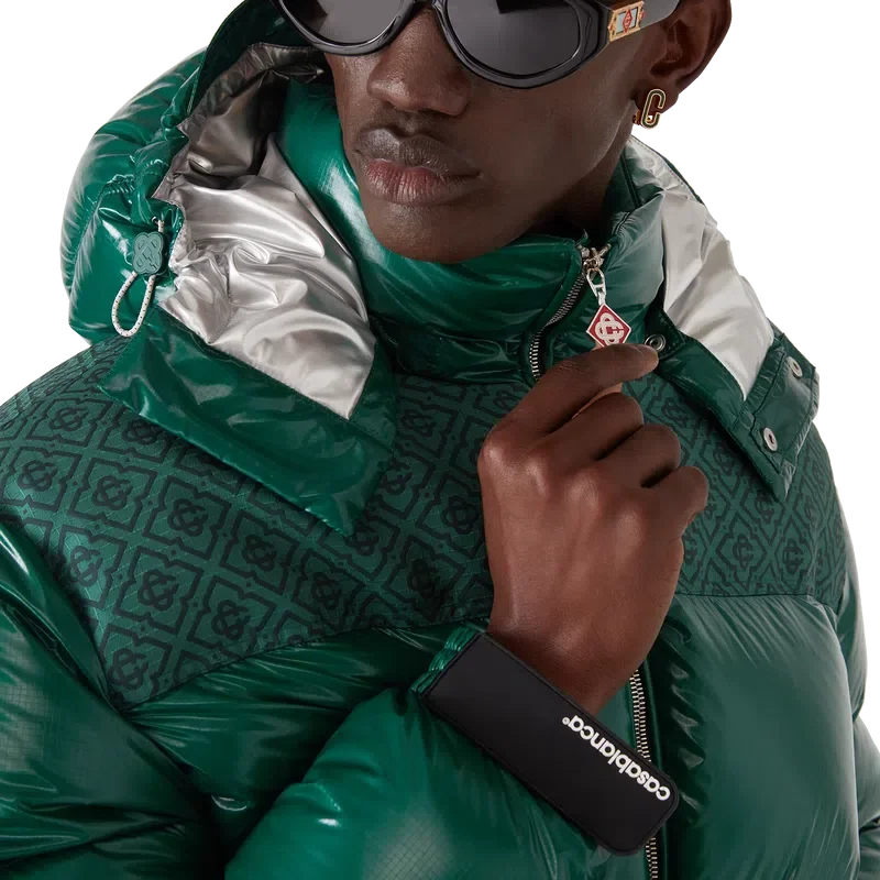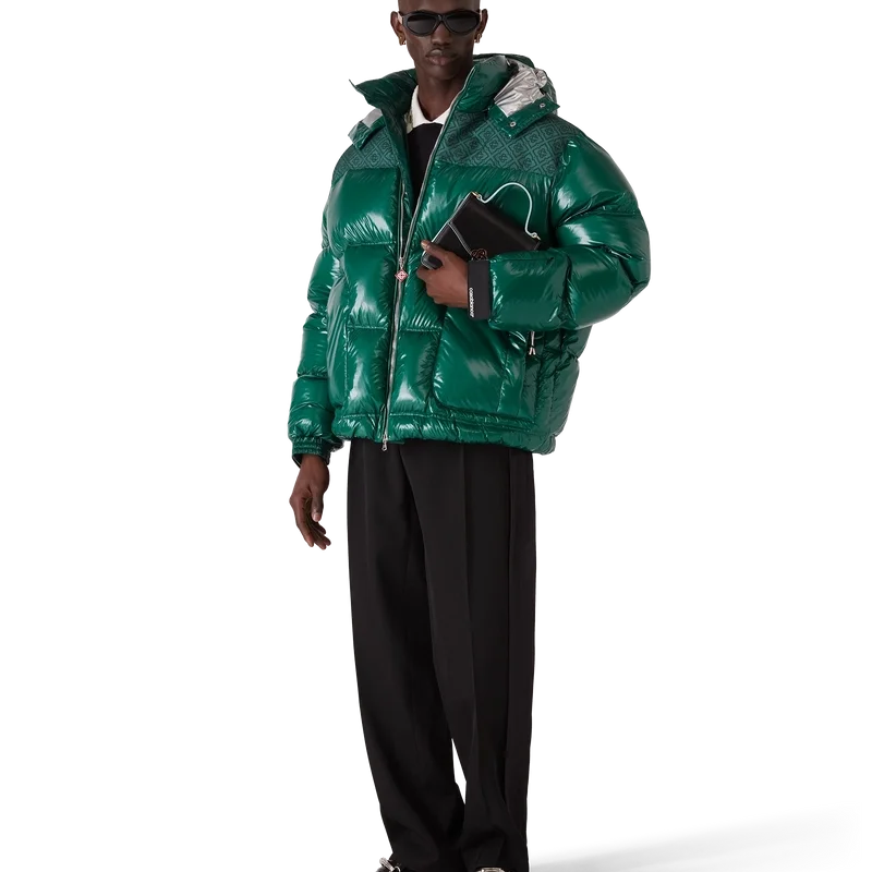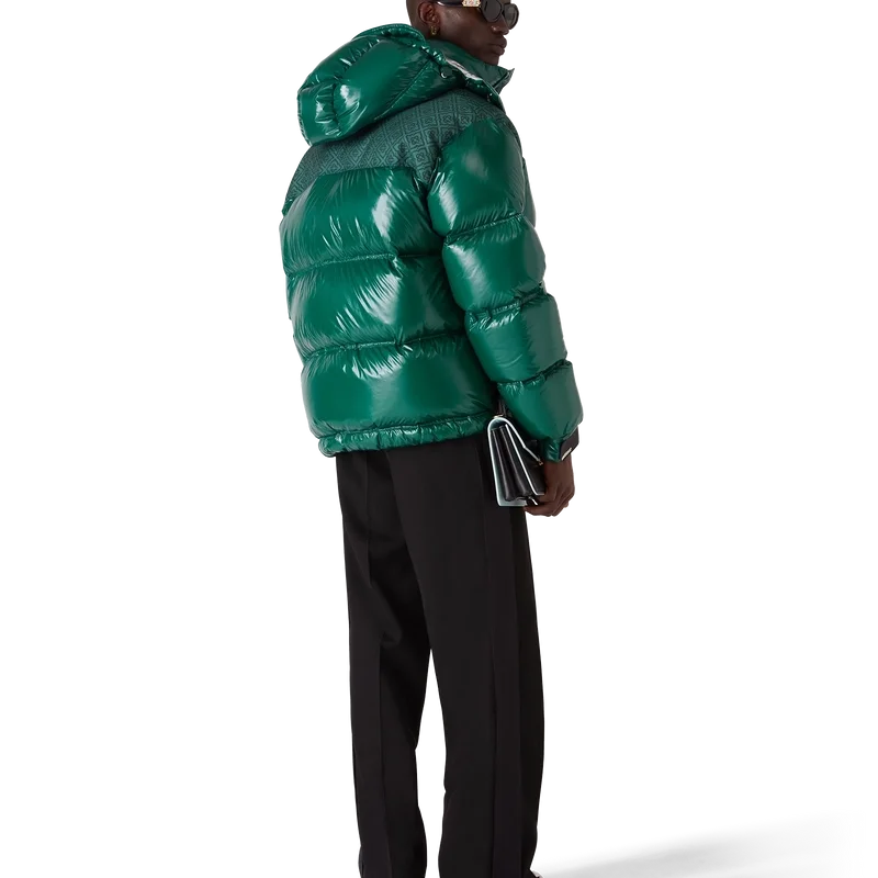 Het nylon puffer-donsjack is een modern, boxy ontwerp voor buitenkleding, vervaardigd uit ripstop nylon met donsvulling en een contrasterend monogram-jacquardpaneel over de schouders. Afgewerkt met een capuchon met Cc-logo-knopen en trekkoordsluitingen, een opstaande kraag voor extra warmte en bescherming tegen de elementen, een ritssluiting met het kenmerkende diamantlogo van het huis op het ritslipje, voorzakken met ritssluiting, verstelbare manchetten met merklogo en elastische zoom en manchetten.
