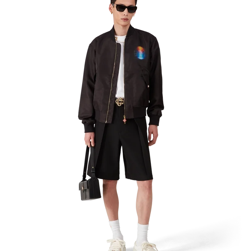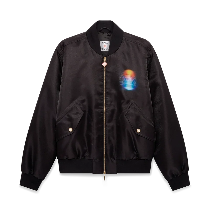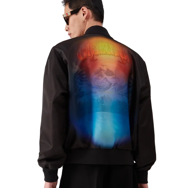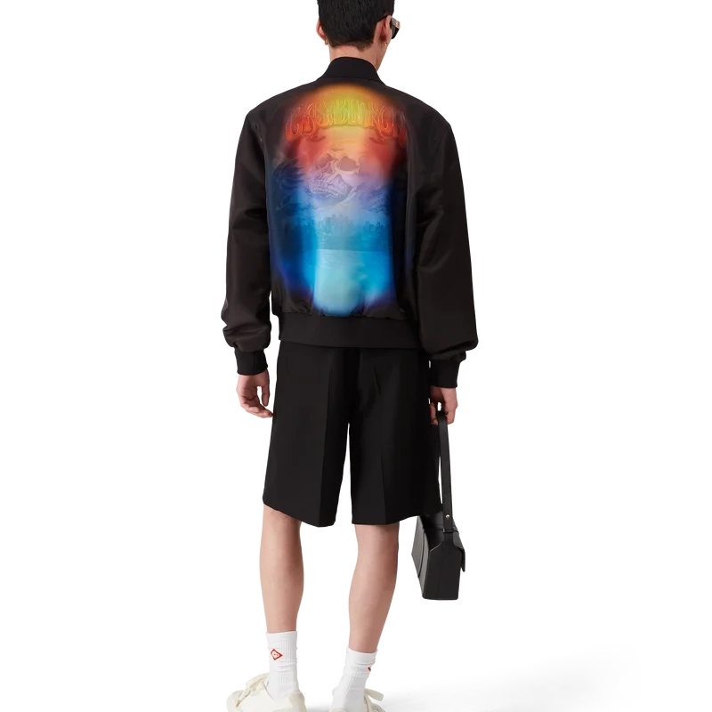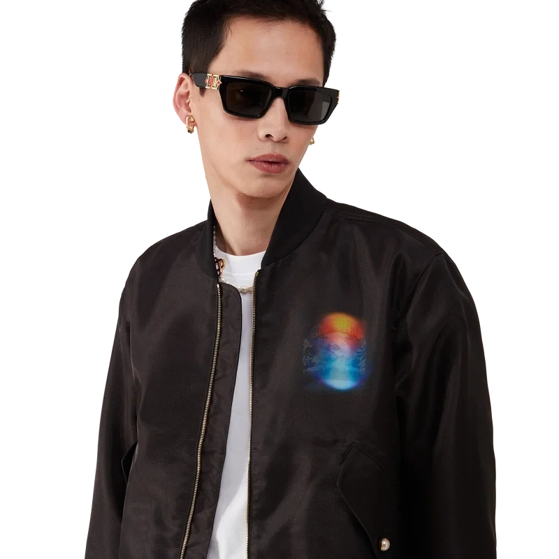 Het Organza Gradient Bomberjack heeft een klassiek silhouet en is vervaardigd uit organza. Het jack is voorzien van het seizoensgradient en La Pramonition-kunstwerk van een griezelig visioen van de skyline van LA bij nacht, met UFO-elementen die verwijzen naar vintage sci-fi-inspiratie – op de borst en rug. Afgewerkt met een ritssluiting, voorzakken met klep en kenmerkende parelknopen met gouden rand, en een opstaande ribkraag, manchetten en zoom.