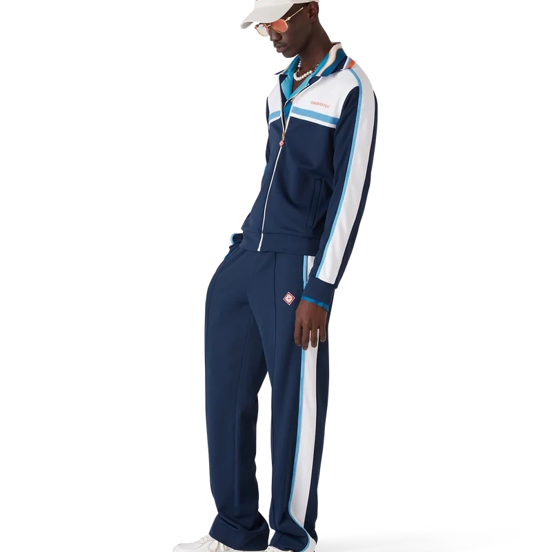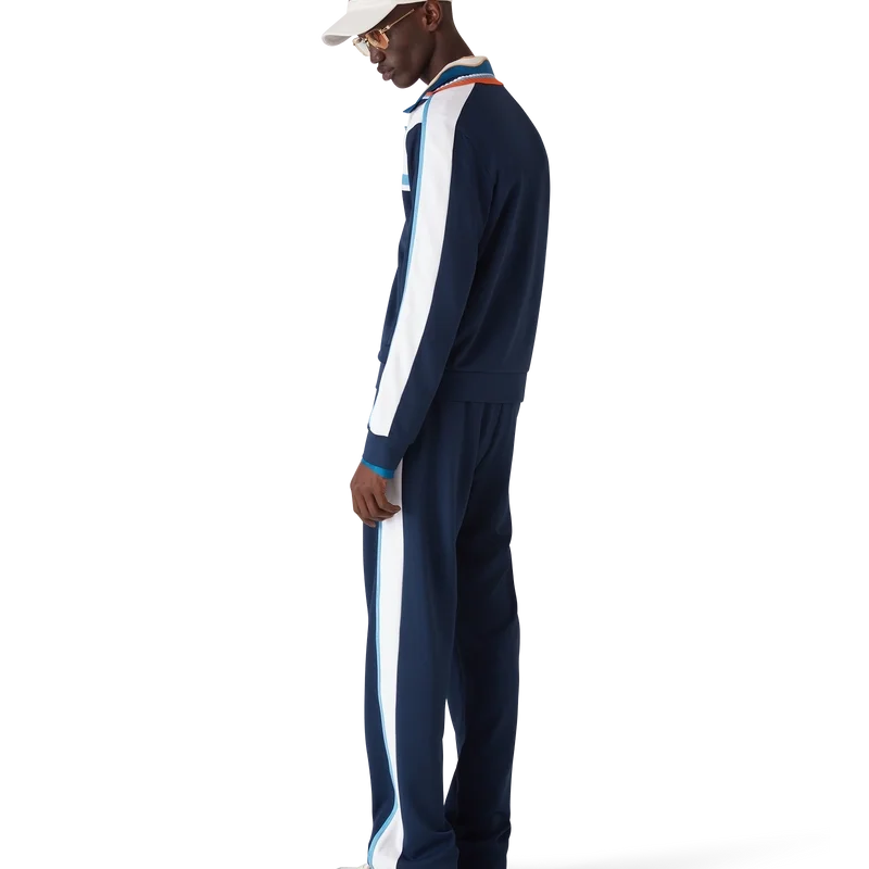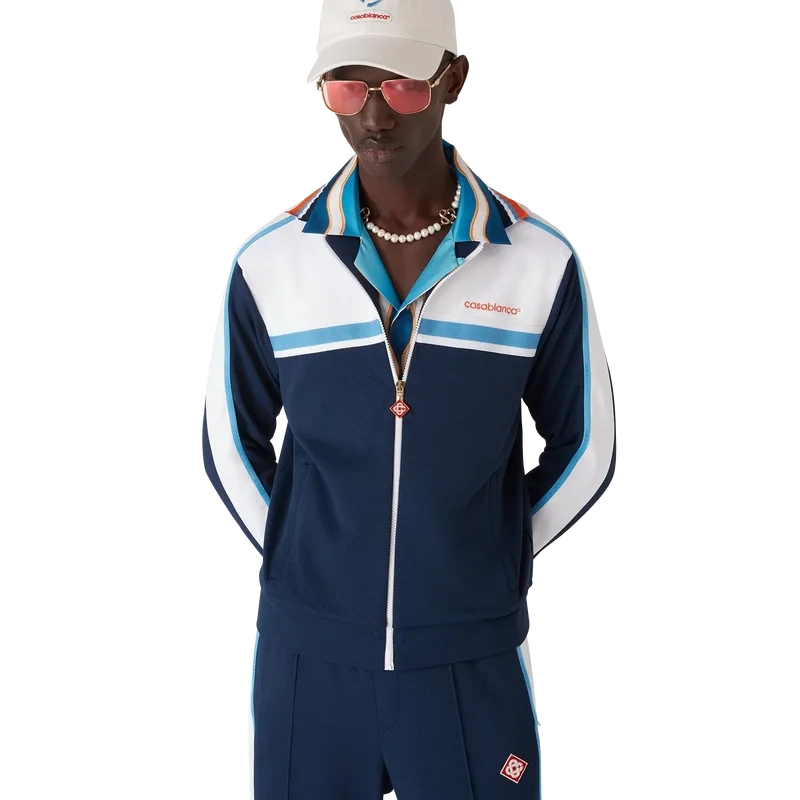 Het piqué trainingsjack is een klassiek sportkledingontwerp, vervaardigd uit rond piqué-stof. Afgewerkt met een geribde kraag, marineblauwe en witte kleurblokken, streepjesdetail over de borst, ritssluiting, geribde manchetten en zoom, en een voering van mesh.