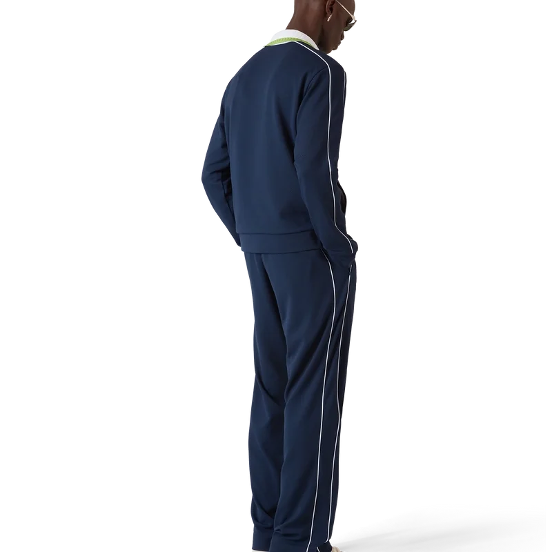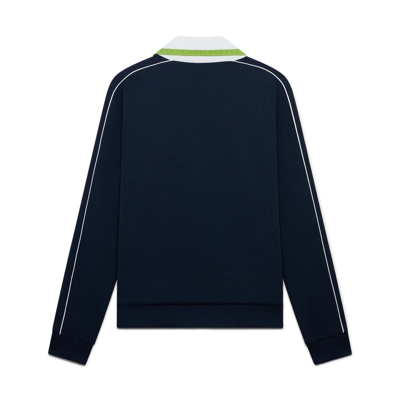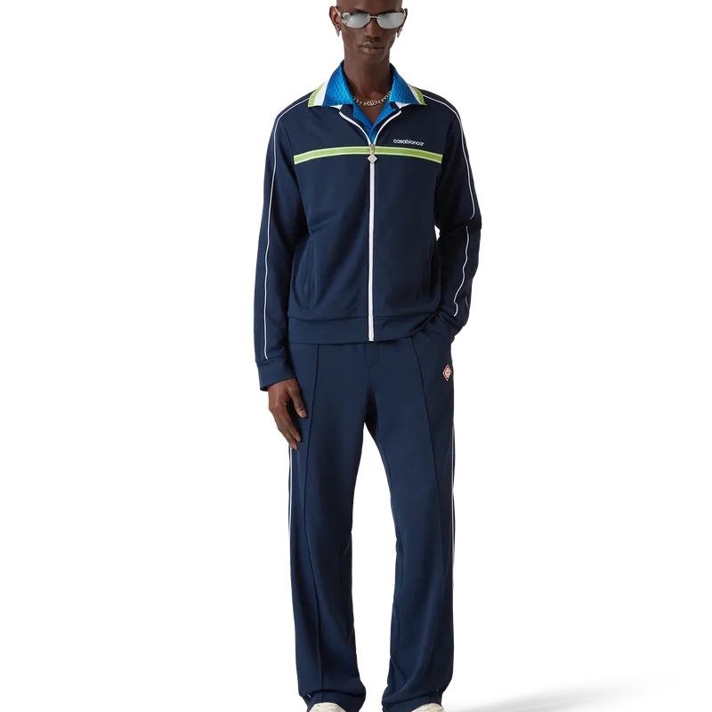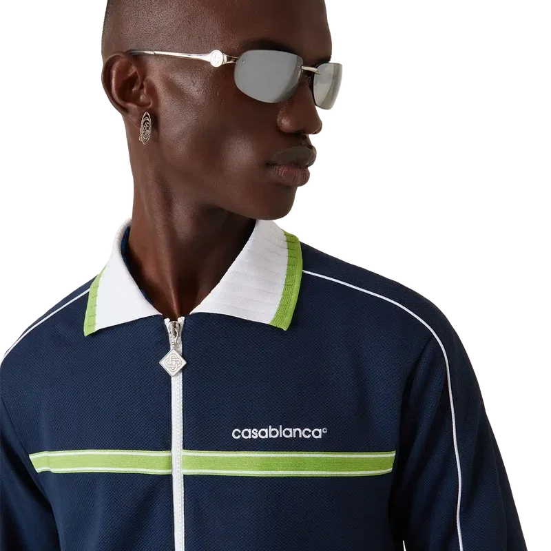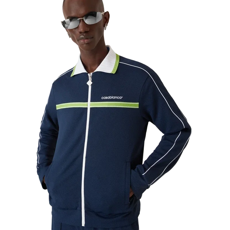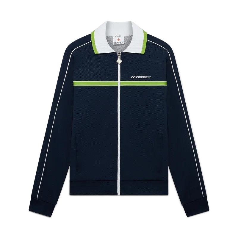 Het piqué trainingsjack is een klassiek sportkledingontwerp met lange mouwen en het Casablanca-logo van het huis. Afgewerkt met een ritssluiting met het kenmerkende diamantlogo van het huis op het ritslipje, een geribde kraag, groene en witte streepjes op de borst, biezen op de schouders en langs de mouwen, een voering en geribde zoom en manchetten.