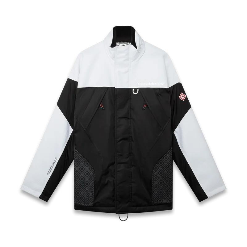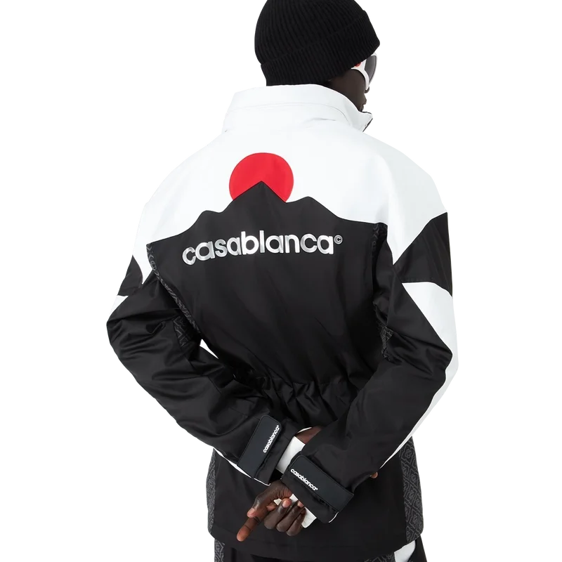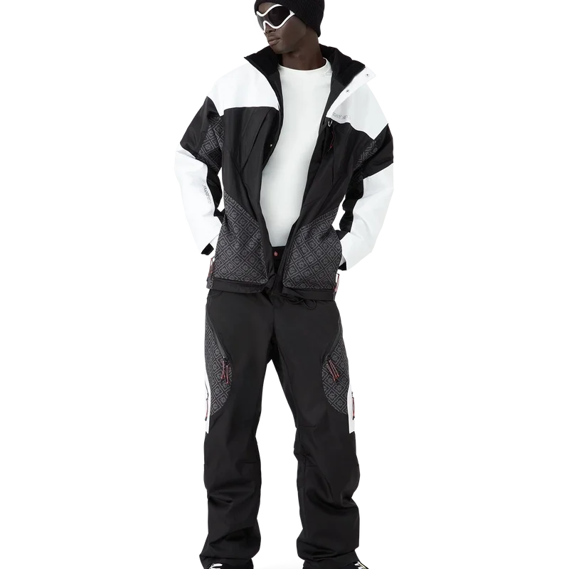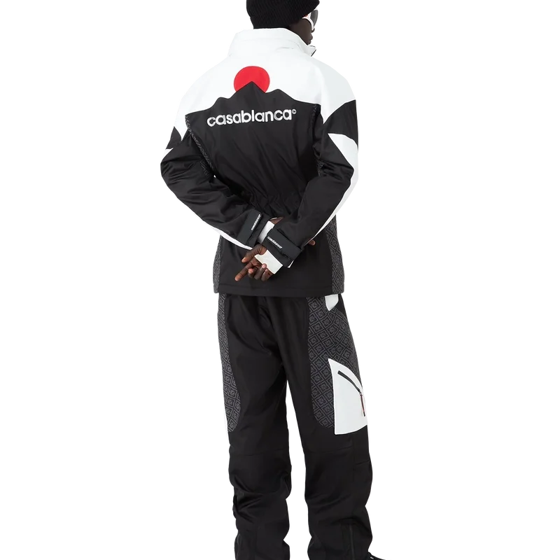 De skijas is een verfijnd ontwerp van buitenkleding, vervaardigd uit ripstop-stof in zwart en wit met contrasterend monogram, geïnspireerd door de grafische schoonheid van het Japanse winterlandschap, waar traditionele patronen weerklinken in de met sneeuw bedekte landschappen. Geïnspireerd door de ritmische geometrie van de landelijke architectuur en het gedurfde contrast van donkere houten structuren tegen schitterende sneeuwvelden. Afgewerkt met ritssluiting, opgestikte zakken met ritssluiting en elastische ritslipjes, verzilverde hardware en ritssluiting bij de enkels.