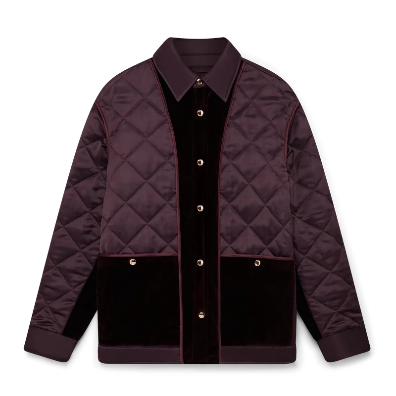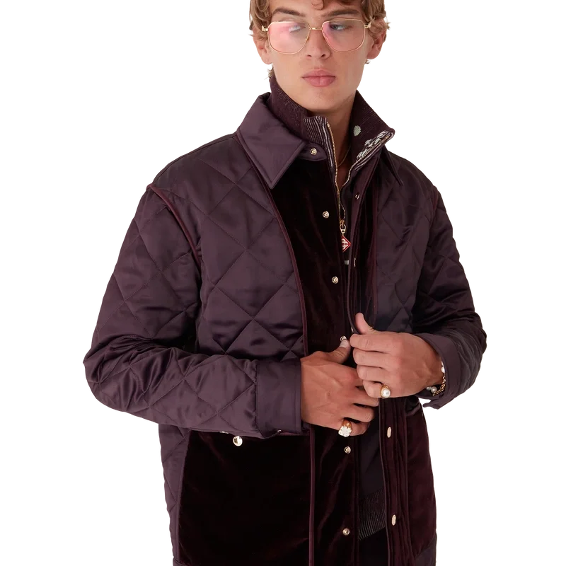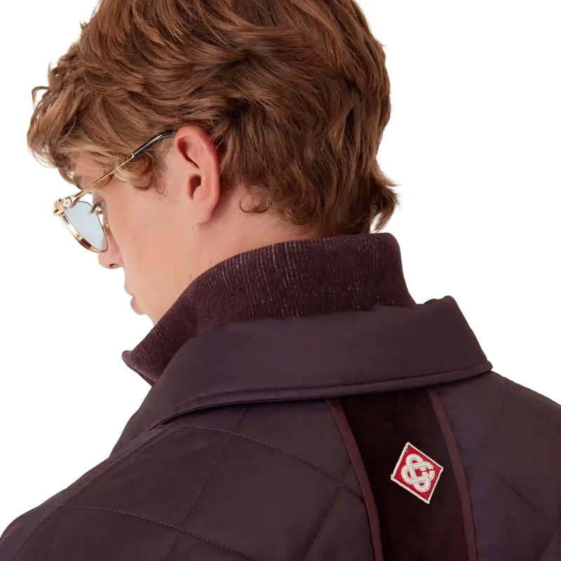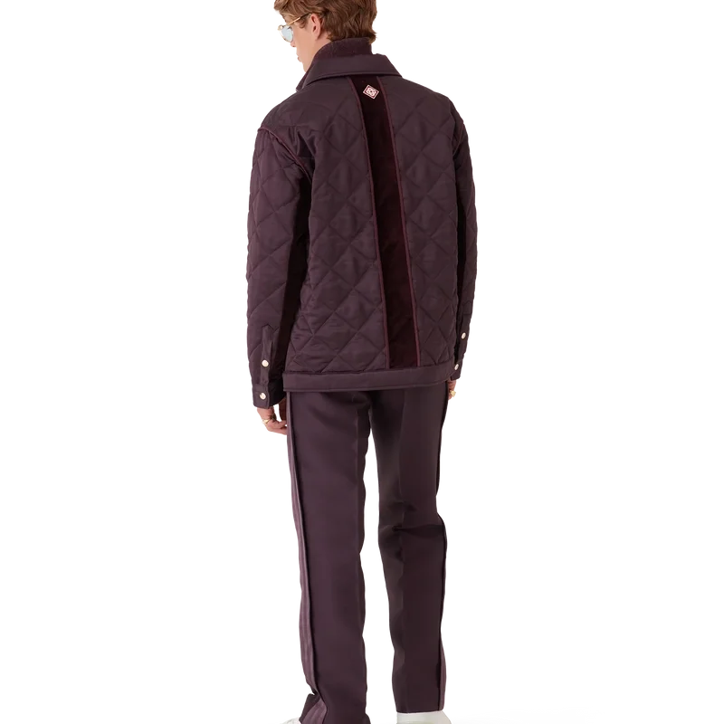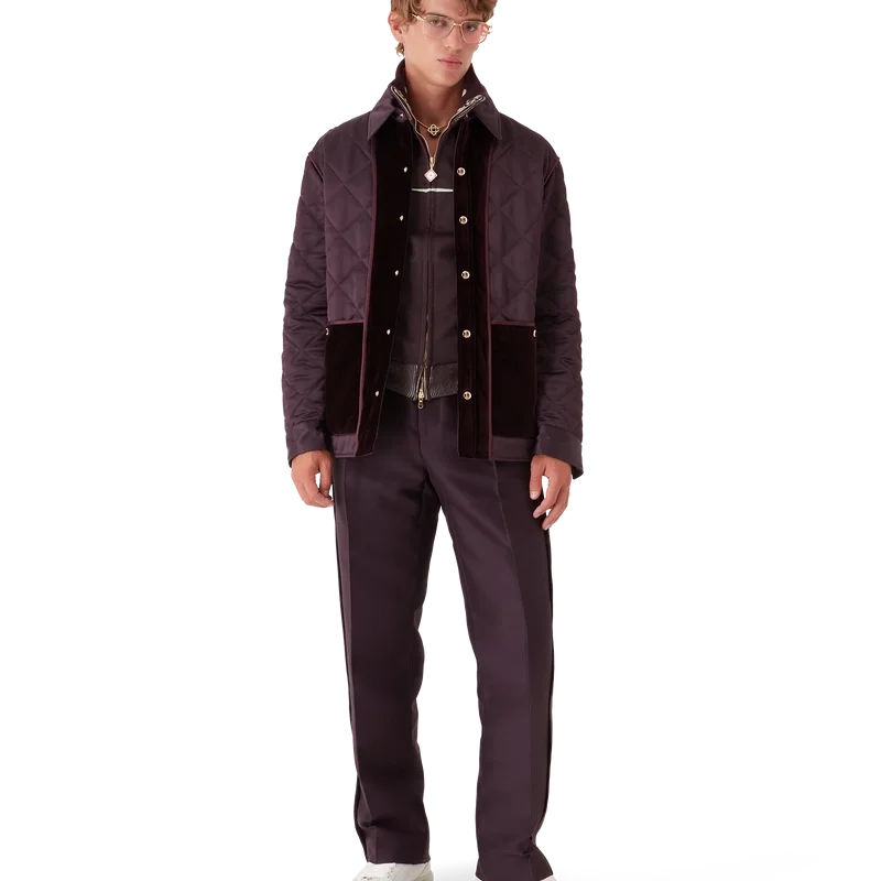 Het satijnen gewatteerde jasje is een Buitenkledingstuk met lange mouwen, vervaardigd uit satijn met een contrast van katoenfluweel. Afgewerkt met een puntkraag, knoopsluiting, vergulde drukknopen met Casablanca-logo, mouwen met katoenfluwelen voering, opgestikte zakken met drukknopsluiting en een paneel middenachter met het kenmerkende diamantlogo van het huis.