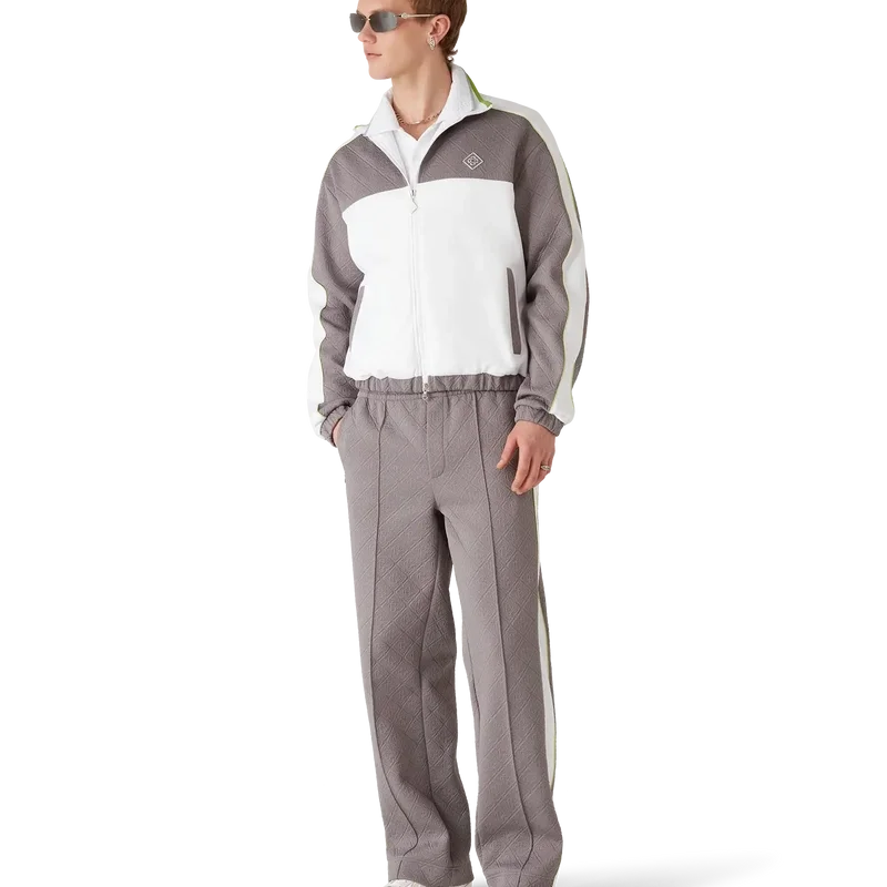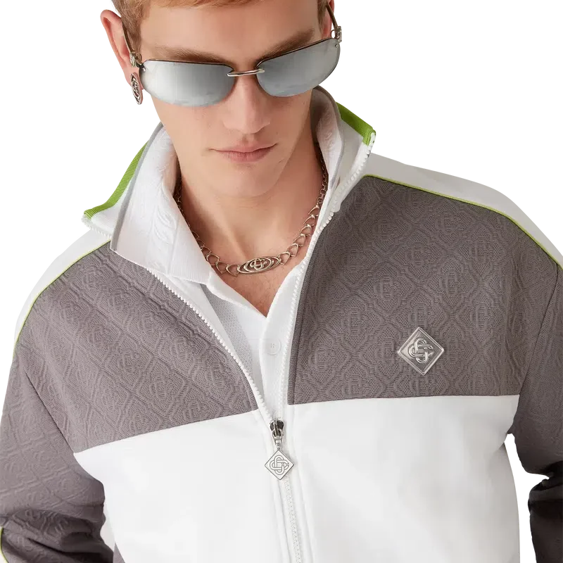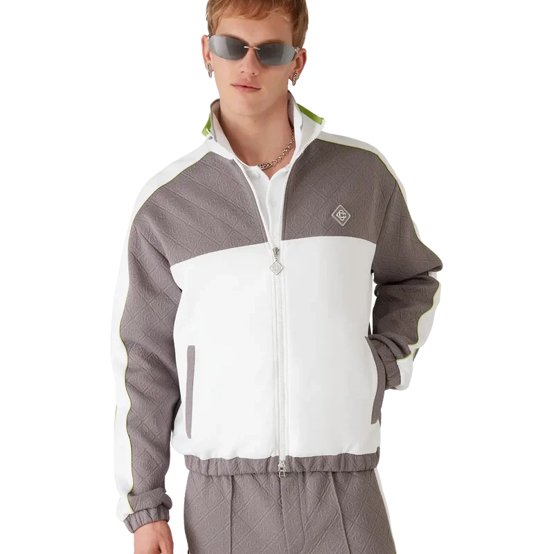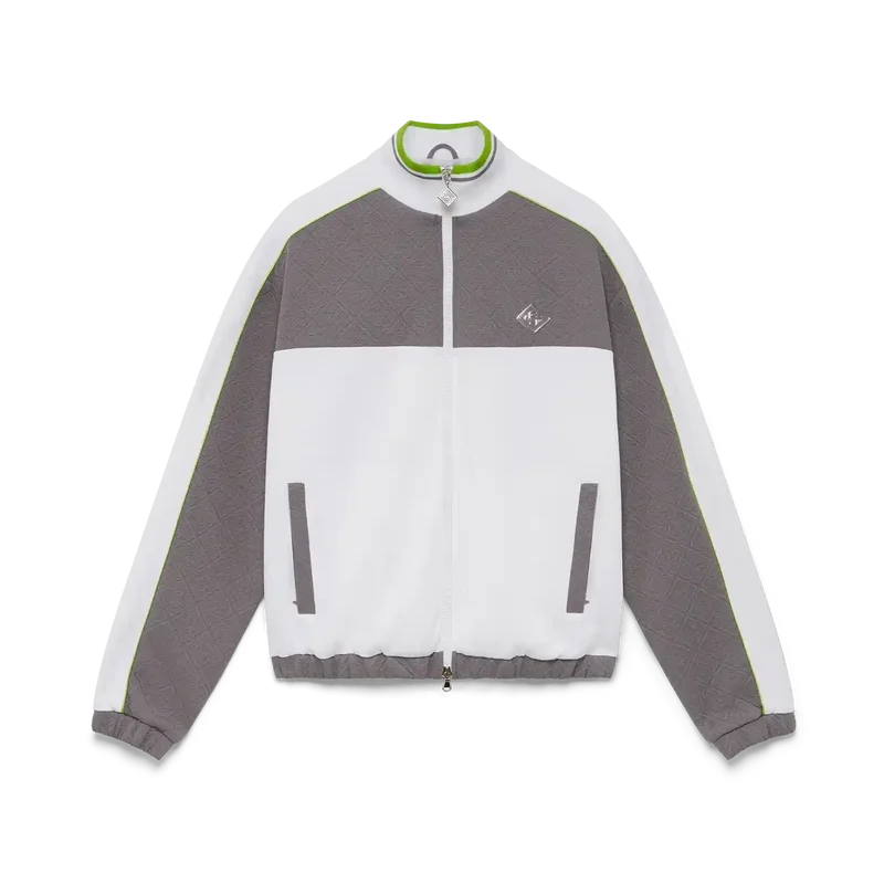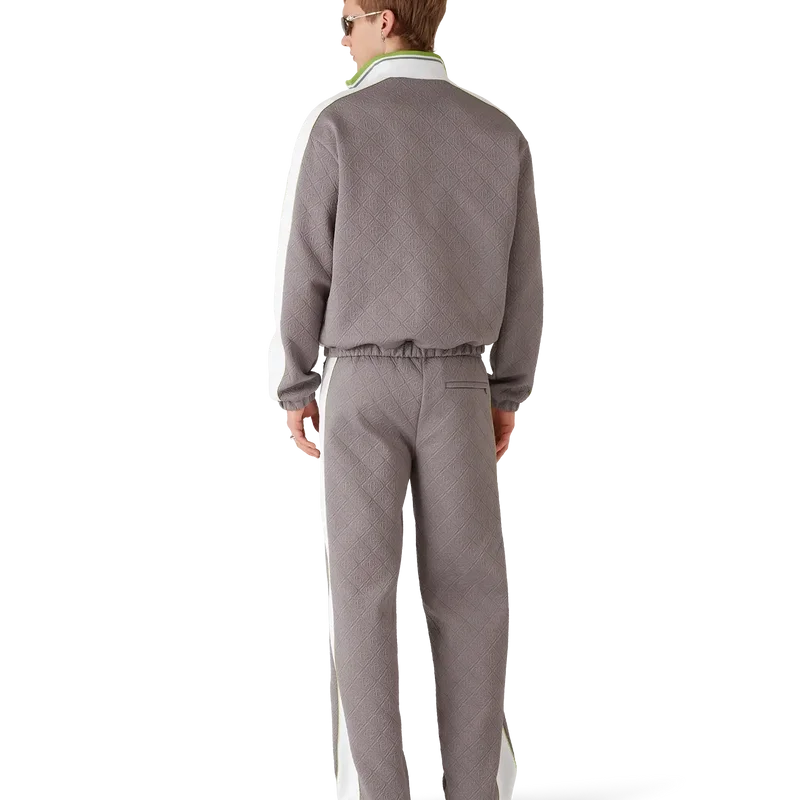 Het Tennis Jacquard trainingsjack heeft een verfijnd ontwerp met het kenmerkende diamantlogo van het huis en monogramstof, verwerkt in een trainingsjack-silhouet. Afgewerkt met een gebreide hoge kraag met gestreepte randdetails, een ritssluiting, verticale paspelzakken, streep- en biesdetails over de schouders en langs de mouwen, en elastische manchetten en zoom.